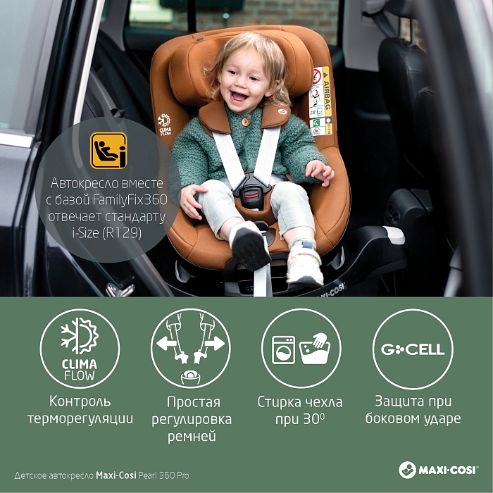 - Соответствует самым высоким и новейшим стандартам безопасности i-Size (R129/03), обеспечивая максимальную безопасность для вашего ребенка.
