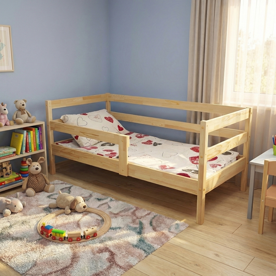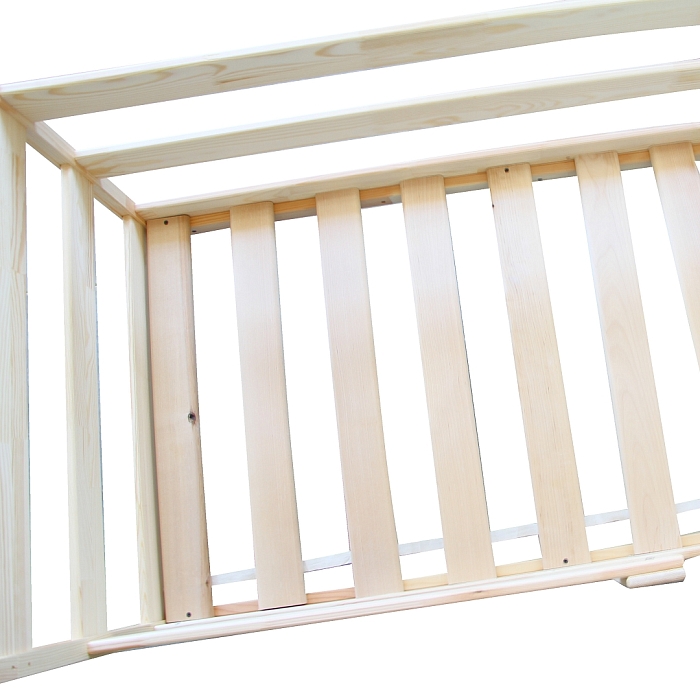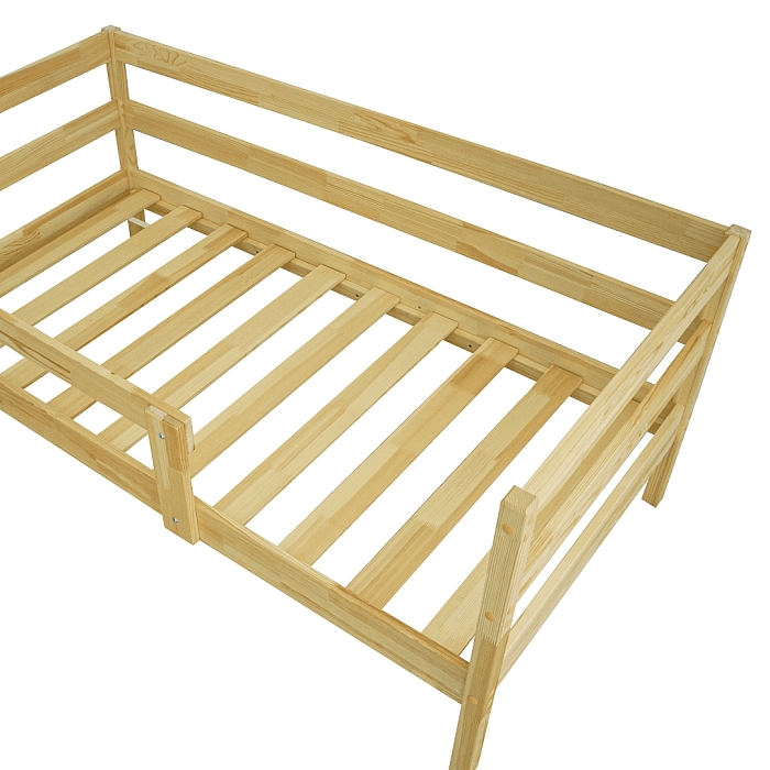 Для безопасности ребенка комплектуется одинарным бортиком, который можно установить как слева, так и справа или вообще без него. Реечное дно из деревянных ламелей. Выдерживает до 80 кг.