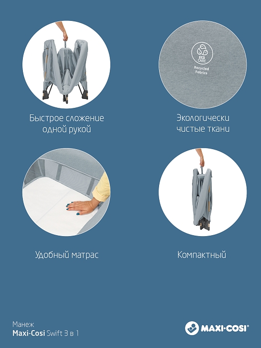 Maxi-Cosi Swift растет вместе с вашим ребенком от рождения до 3,5 лет. Чтобы не покупать три отдельных портативных продукта (люльку, детскую кроватку и игровой манеж), Swift представляет собой все три, стильно объединенные в одно целое.