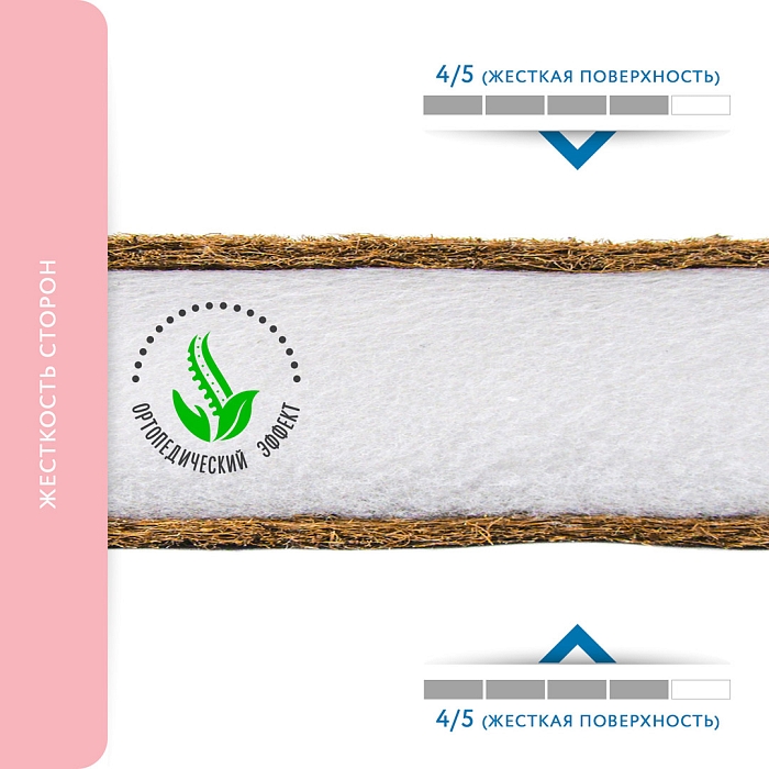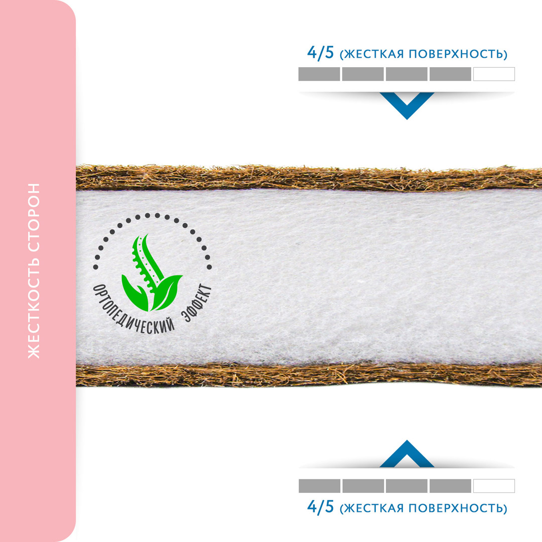 Матрас в колыбель с многослойным наполнителем, состоящим из плиты холлофайбера, усиленной с обеих сторон листами натурального кокоса. Ткань покрытия - стеганая микрофибра.
