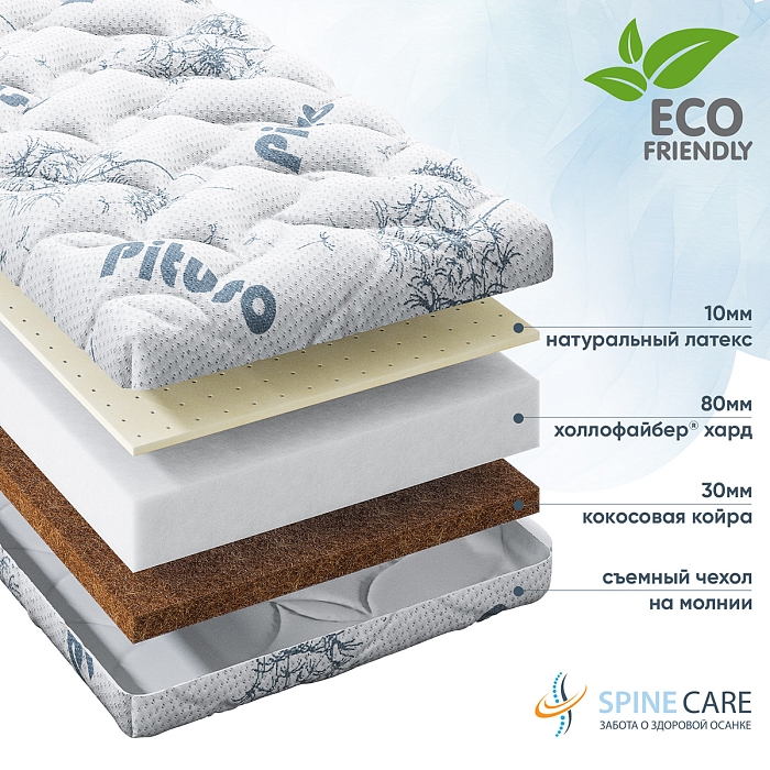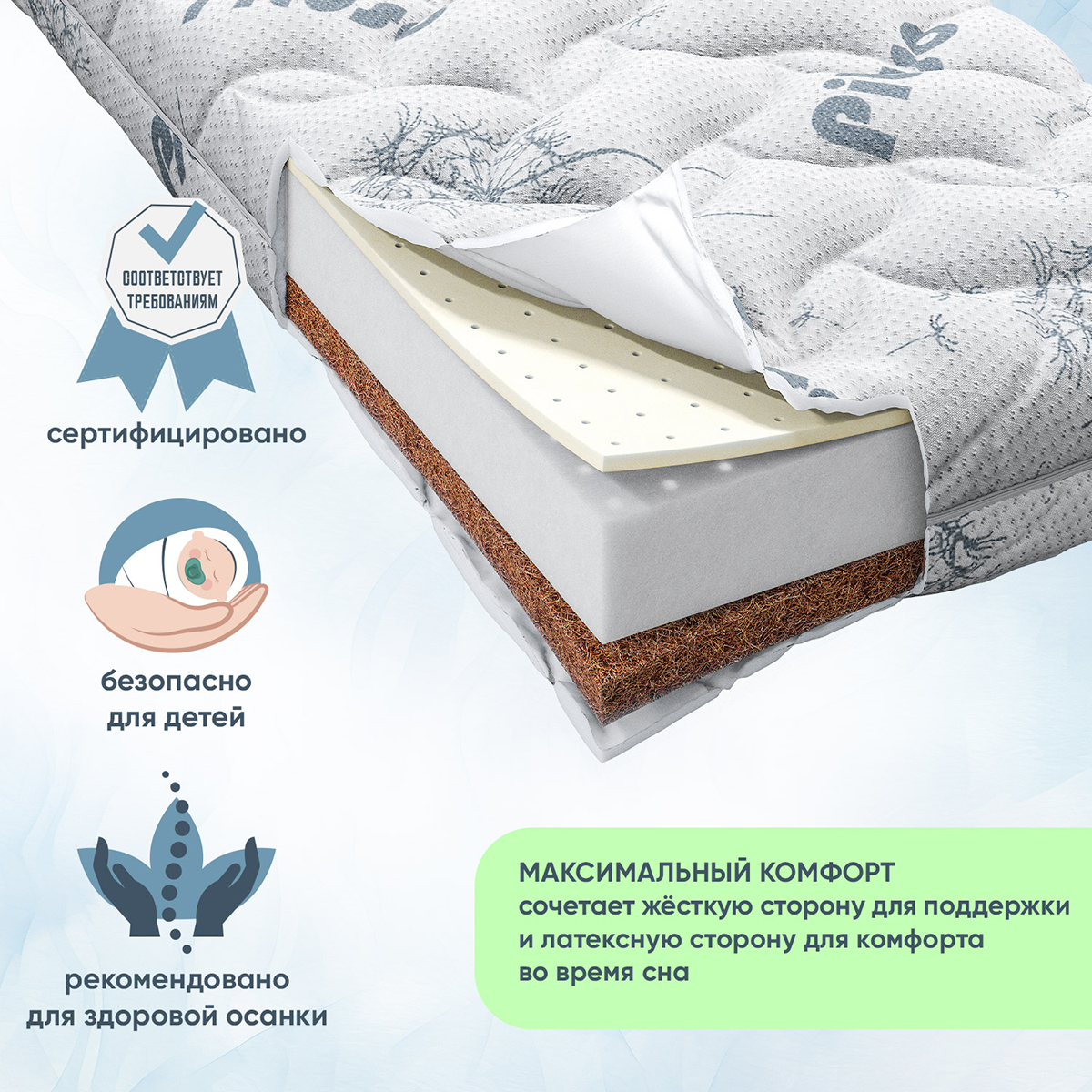 Повышенную ортопедическую жесткость одной из сторон матраса обеспечивает трипл-слой из натуральной кокосовой койры. Эта сторона подойдет как новорожденным малышам, так и деткам постарше.