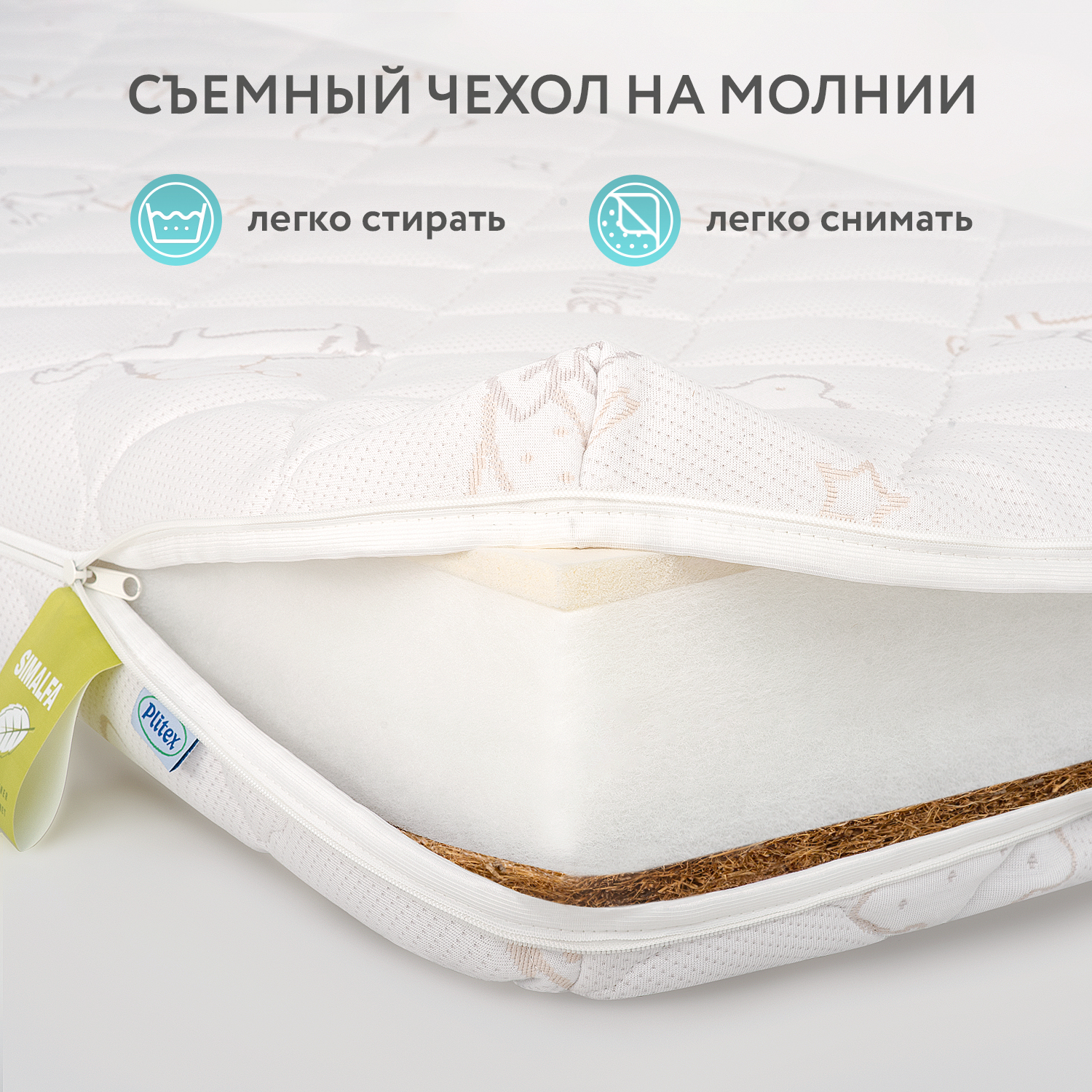 Съемный чехол на молнии - Это важное условие, на которое мы рекомендуем обращать особое внимание при покупке матраса. Съемный чехол упростит уход за матрасом и позволит Вам удостовериться, что наполнители соответствуют заявленному качеству. В матрасе Plitex молния с трех сторон чехла — так его гораздо легче снимать и надевать.