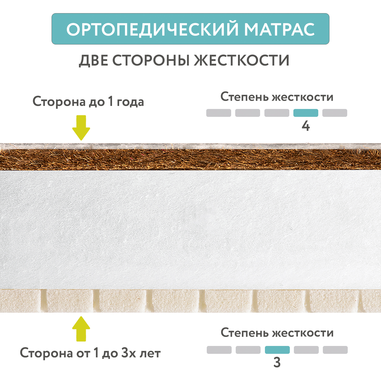 Беспружинный ортопедический матрас - имеет две стороны разной жесткости, обеспечивает здоровый и комфортный сон детей от рождения до 3-4 лет.