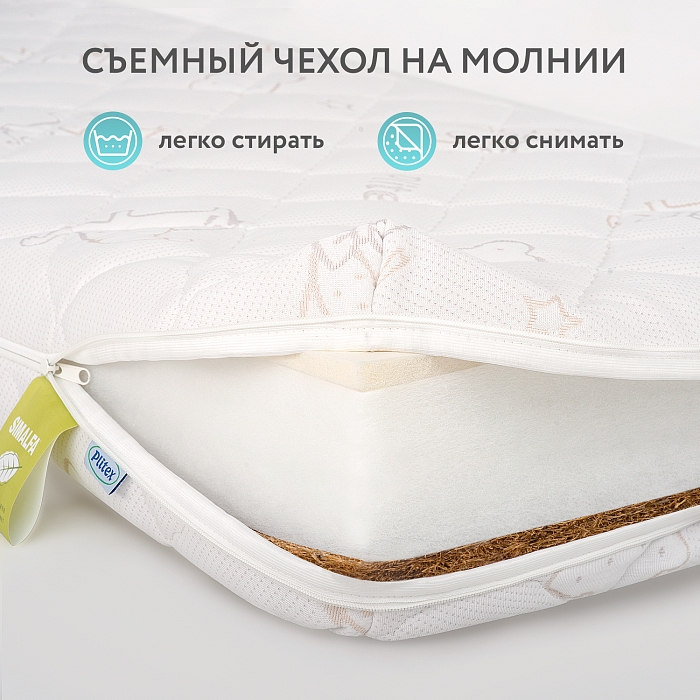 На стороне для новорожденных мы используем натуральную кокосовую койру, волокна которой скреплены натуральным латексом. Натуральный наполнитель более упругий, чем его аналоги, он дольше сохраняет свои свойства, не колется и не проминается