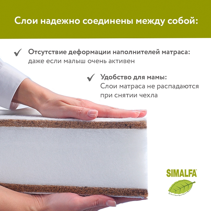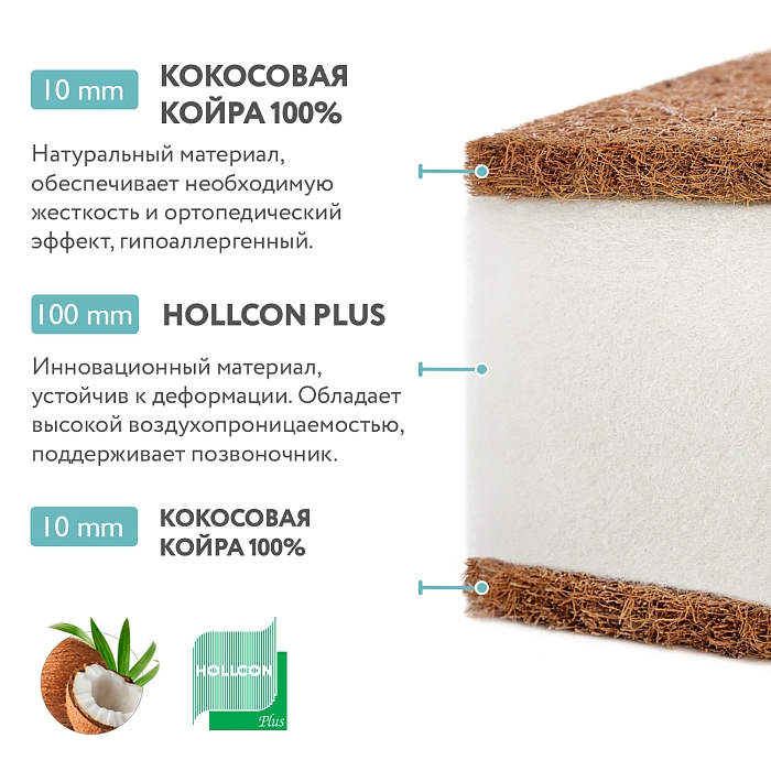Слой латексированной кокосовой койры по обеим сторонам придает жесткость, необходимую правильному детскому матрасу.