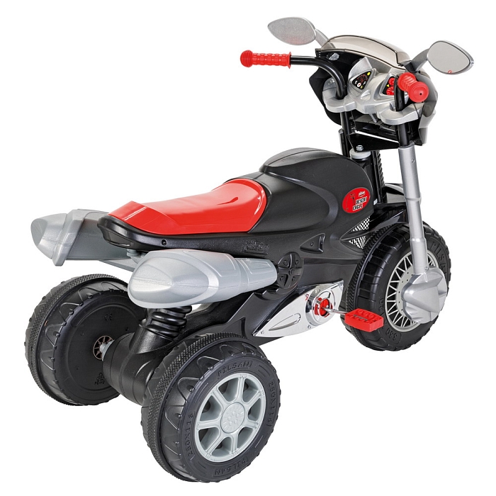 Мотоцикл оснащен 3-мя литыми большими колесами, в передней части корпуса рулевая колонка украшена фарой и удобным широким рулем. Резиновые грипсы выполнены с рельефными узорами, которые предотвращают соскальзывание ладони с руля во время катания.