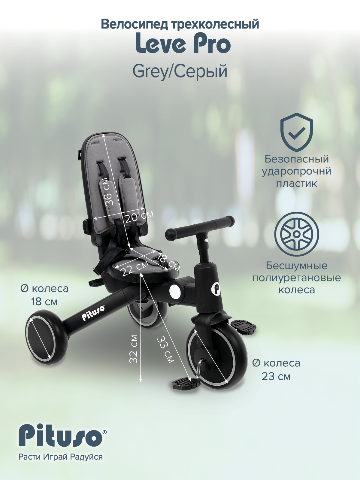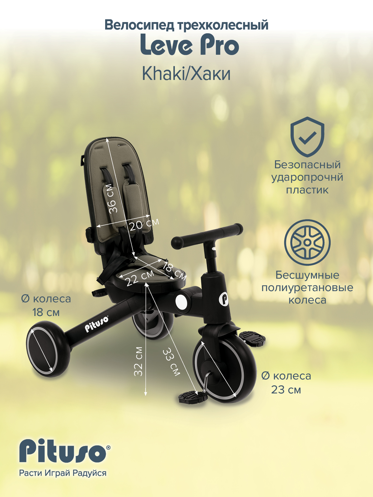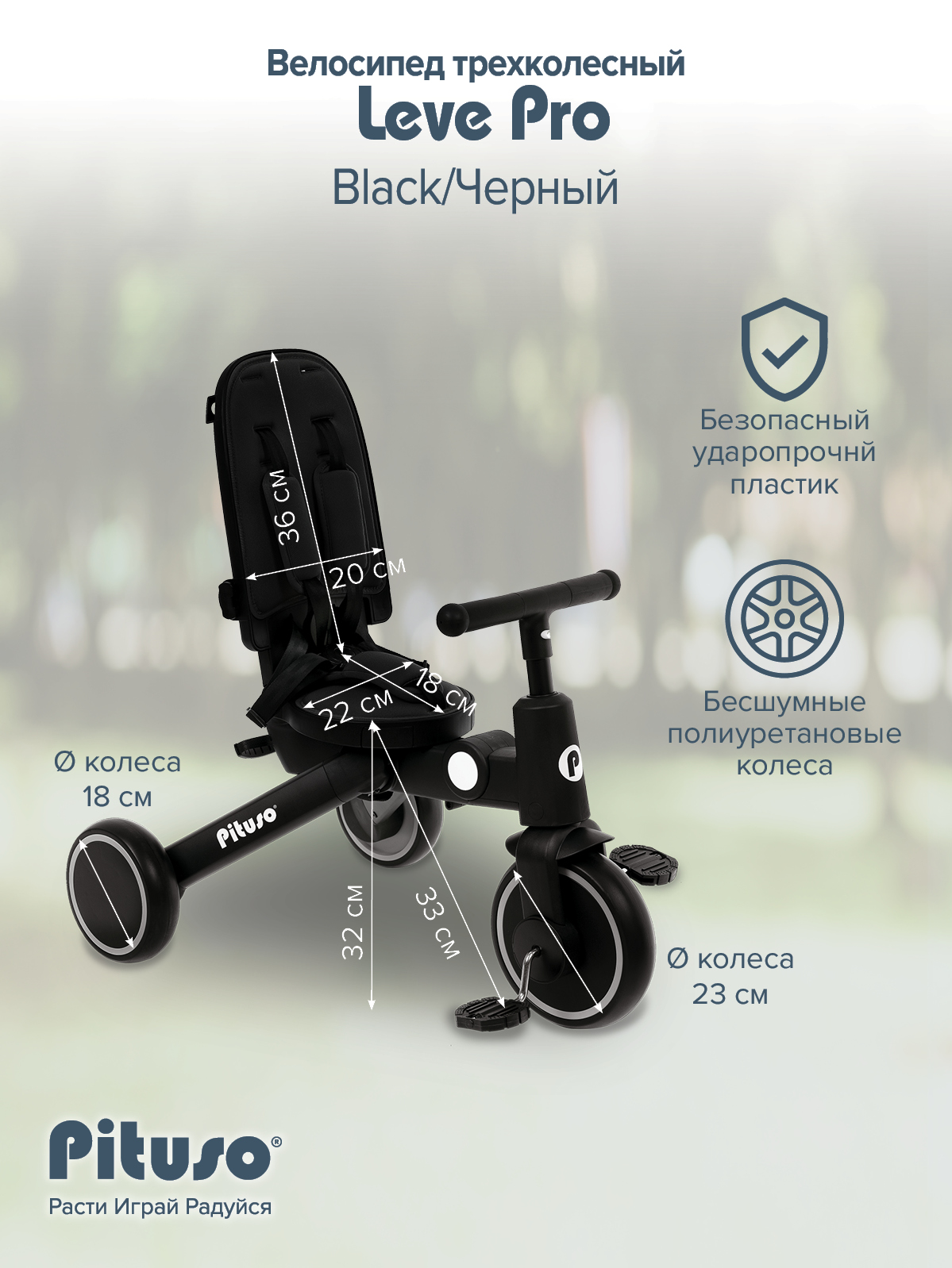 - Переднее колесо D23см, задние колеса D18см