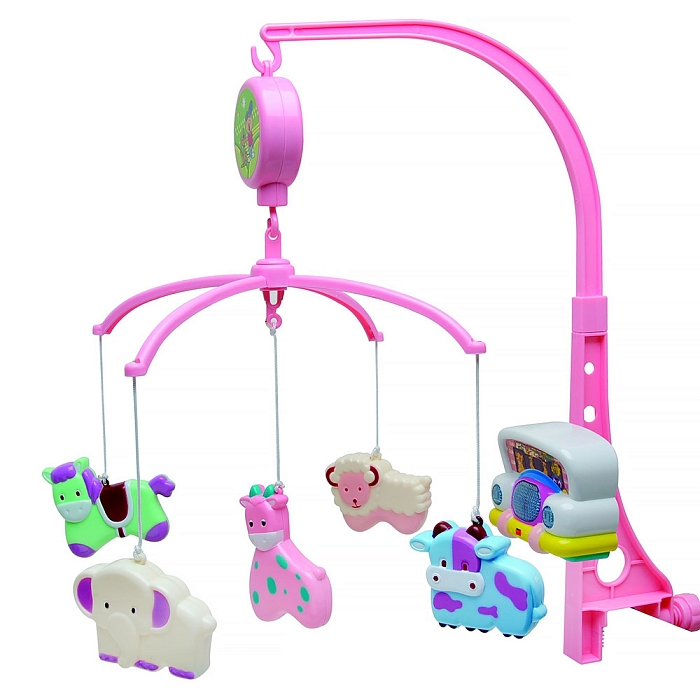 Мелодичная песенка и завораживающее движения игрушек-подвесок позабавят малыша.
