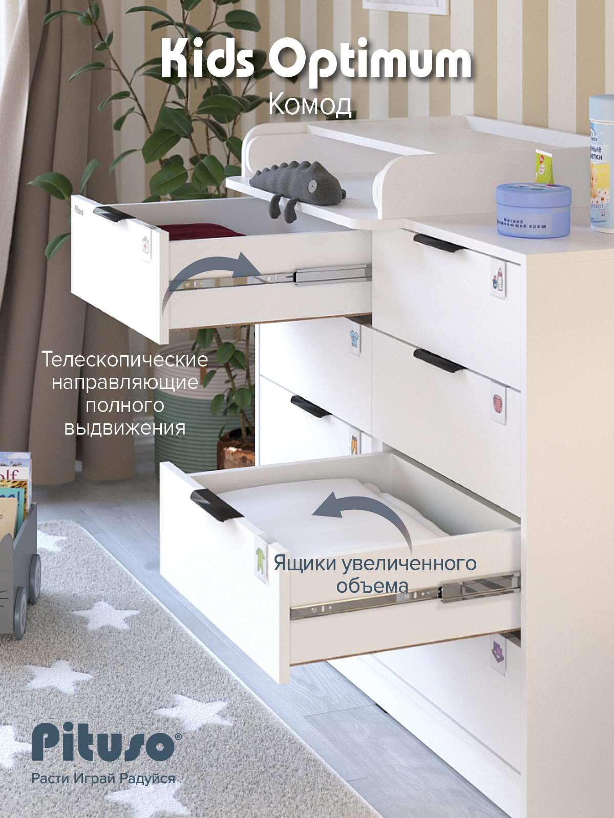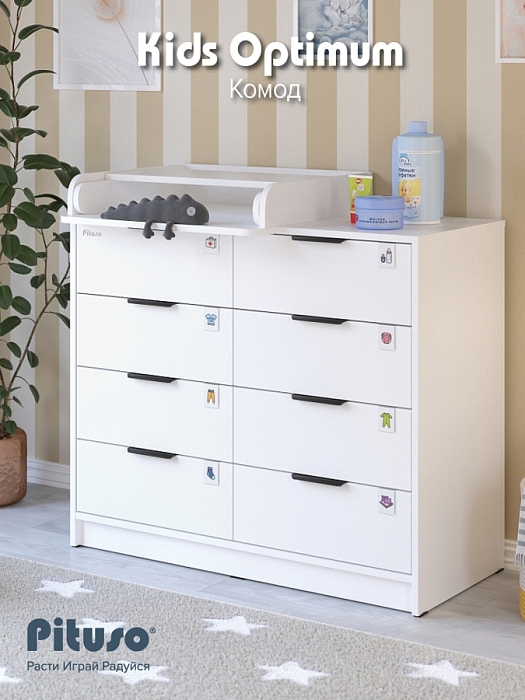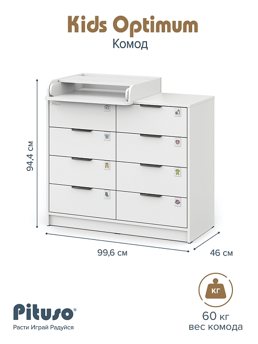 Комод пеленальный Pituso Optimum–большой, вместительный, из 8-ми ящиков, комод с легкосъемным раскладным пеленальным столиком. Ширина комода 100 см.