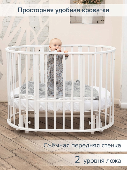 В первые месяцы жизни в круглой кроватке малыш чувствует себя очень комфортно! Девять вариантов трансформации позволяют использовать кроватку продолжительное время.
