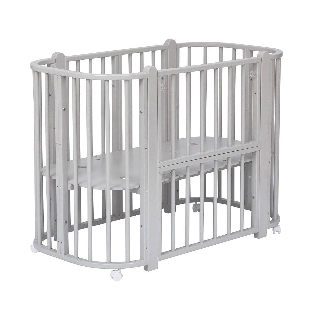 Современная кроватка необычной овальной формы для ребенка с рождения до 3 лет. Уже доказано, что ребенок в первые месяцы после рождения лучше спит в небольшом ограниченном пространстве, там более уютно и спокойно. В этот период рекомендуем использовать колыбель (круглая). В дальнейшем, кроватка трансформируется в полноценную овальную кроватку с закругленными углами. У кроватки простой, но очень красивый внешний вид. Она полностью безопасна для ребенка и не имеет острых углов. В комплекте с кроваткой идут колёса для удобного перемещения по комнате. Кроватка проходит в стандартный дверной проём.