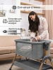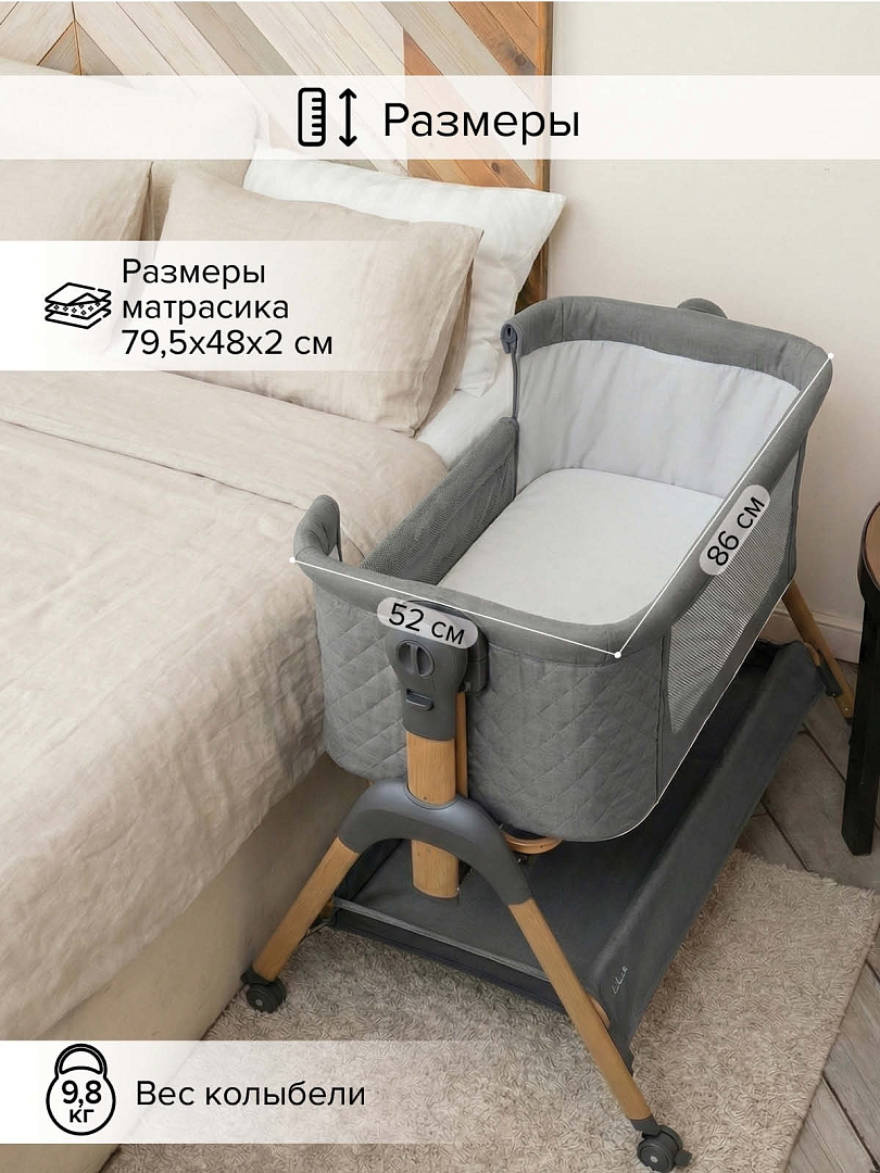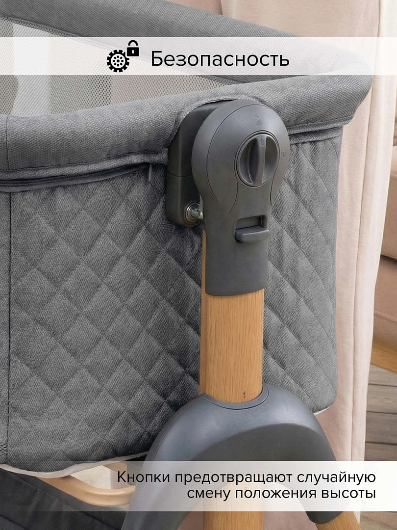 • Всегда рядом: Специальная система крепления (ремни) позволяет быстро приставить колыбель вплотную к вашей кровати. Боковой бортик опускается на молнии, создавая единое пространство.