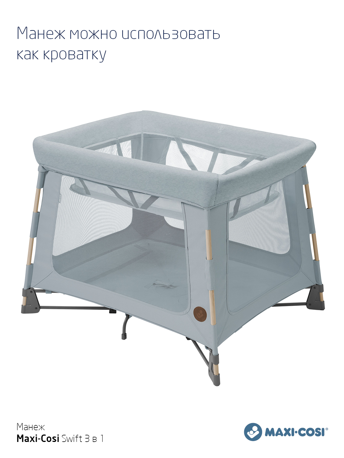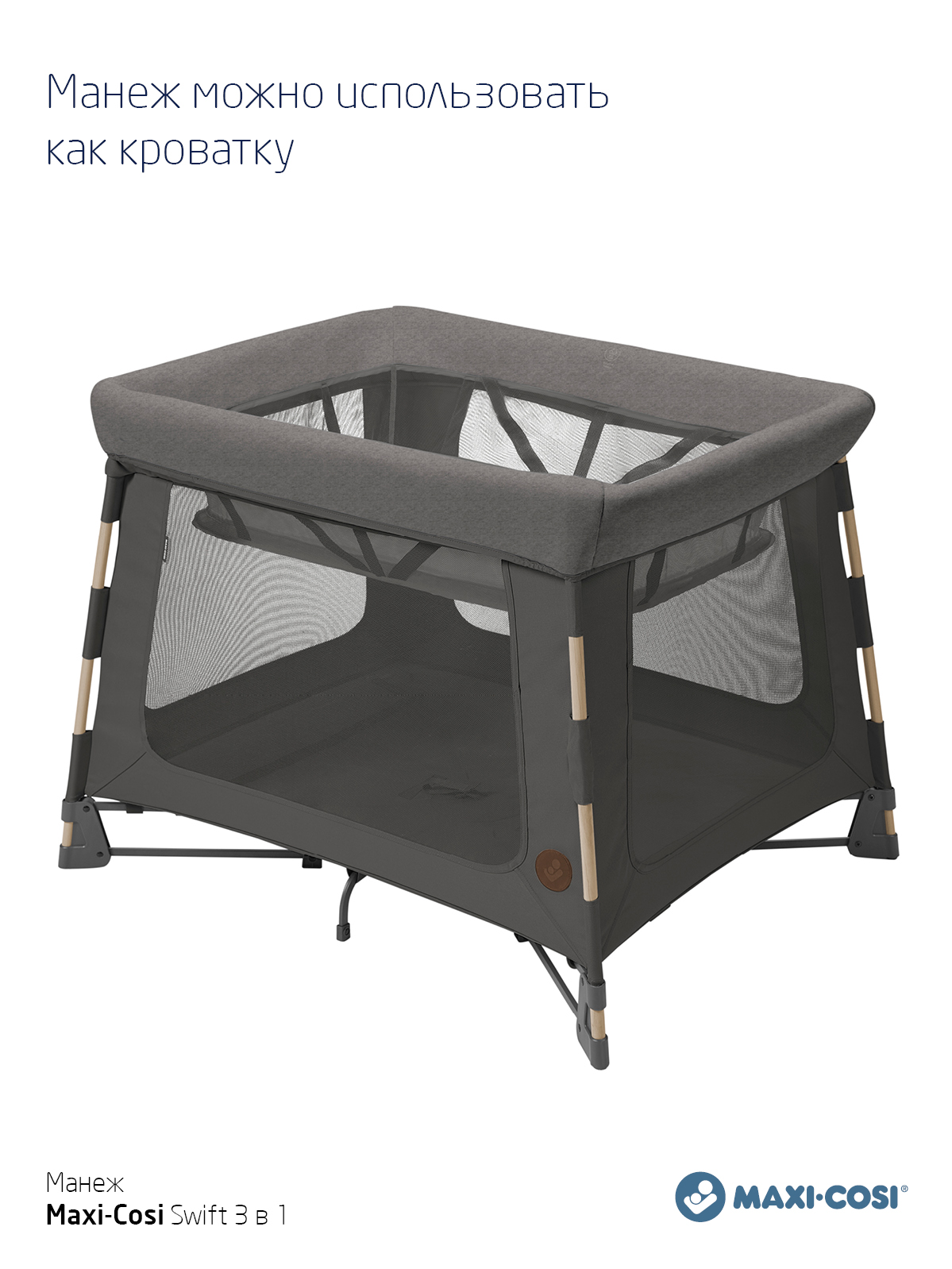 Maxi-Cosi Swift – универсальный стильный манеж 3 в 1, которую можно использовать как люльку для новорожденного, кроватку и прочный манеж для игр. Складывается за одну секунду.
