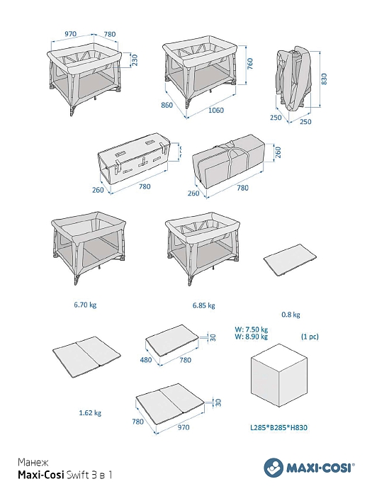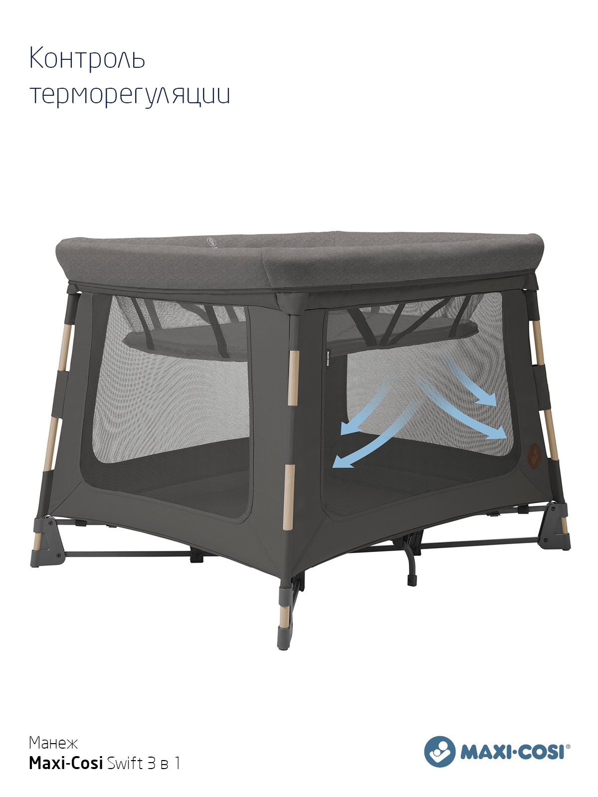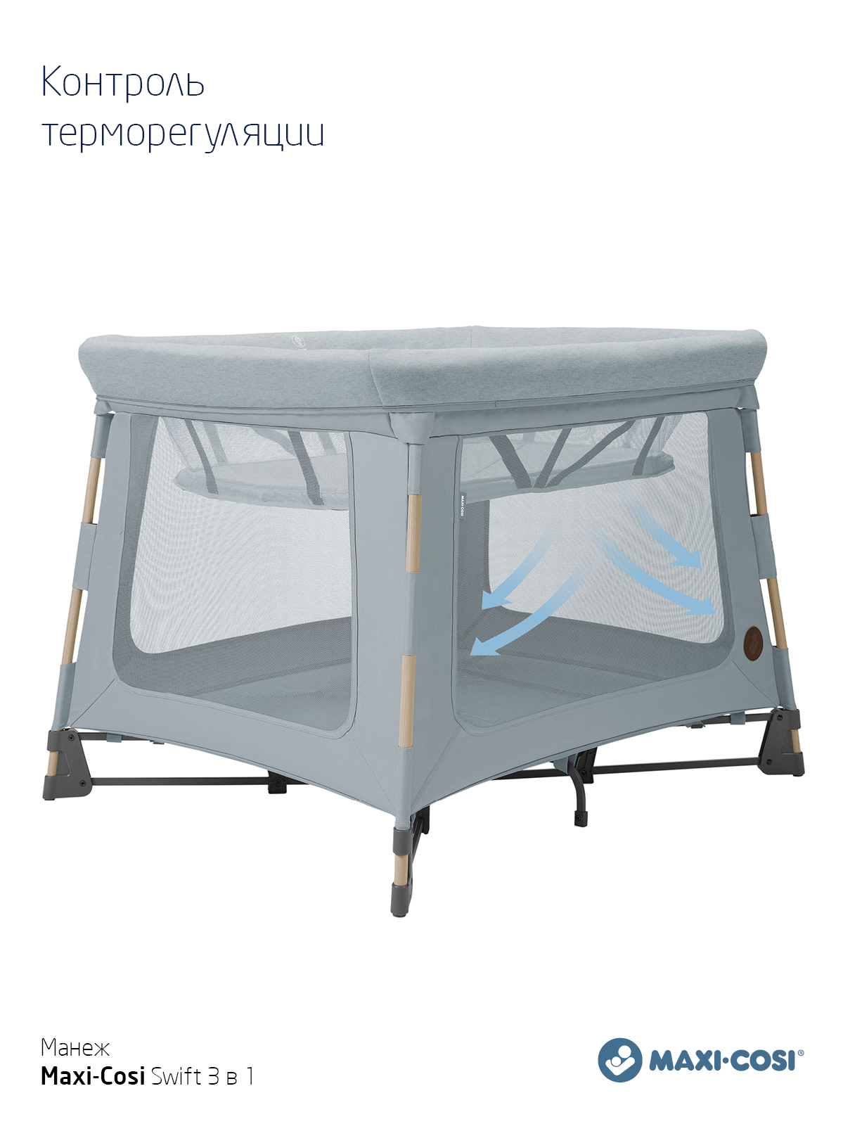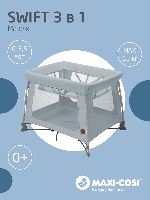 Maxi-Cosi Swift растет вместе с вашим ребенком от рождения до 3,5 лет. Чтобы не покупать три отдельных портативных продукта (люльку, детскую кроватку и игровой манеж), Swift представляет собой все три, стильно объединенные в одно целое.