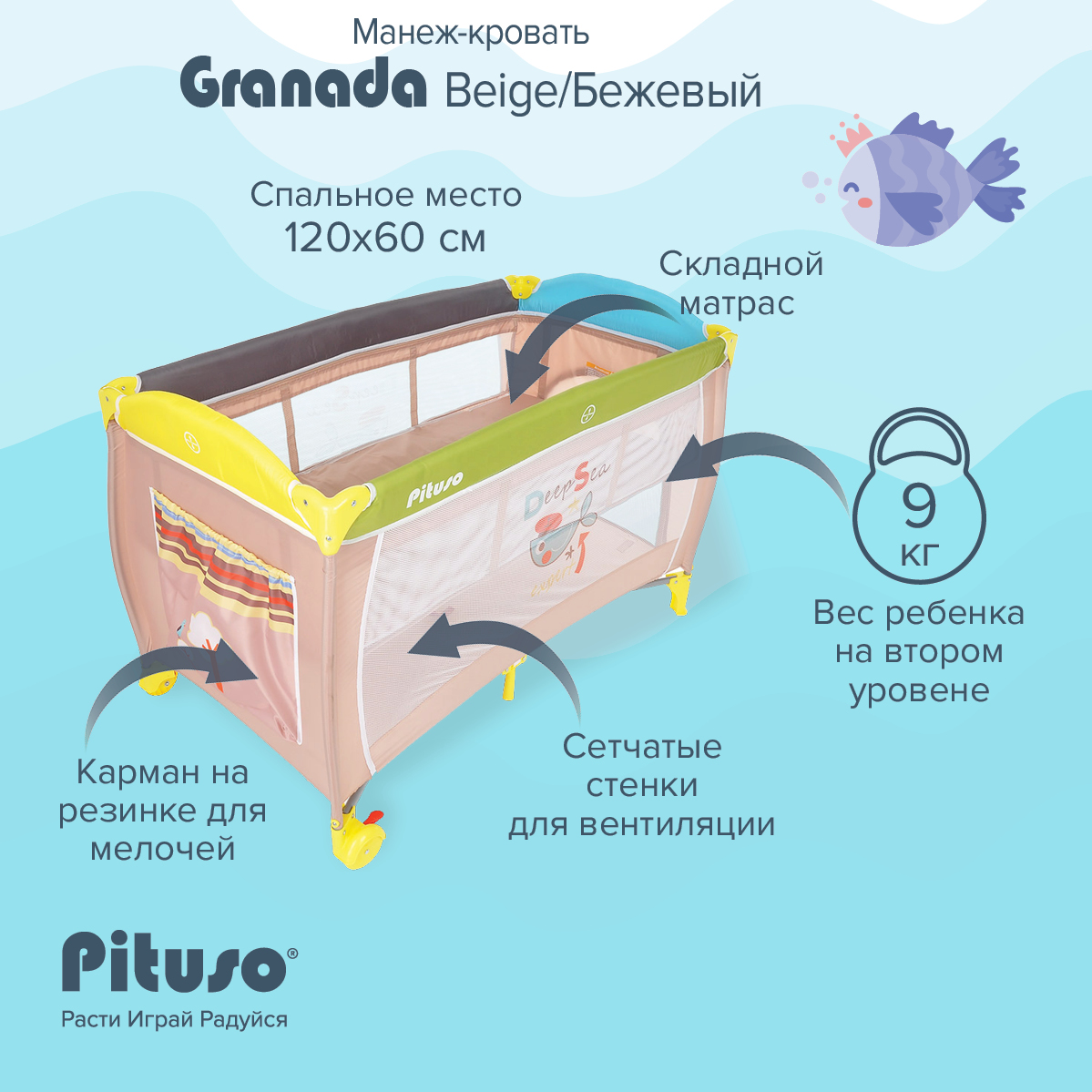 Двухуровневый манеж Pituso Granada создает безопасное, удобное и комфортное пространство, где ребенок может весело играть и отдыхать вместе с любимыми игрушками.