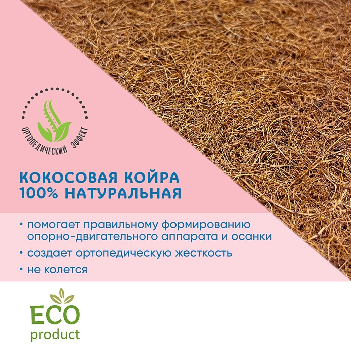 Матрас в колыбель с многослойным наполнителем, состоящим из плиты холлофайбера, усиленной с обеих сторон листами натурального кокоса. Ткань покрытия - стеганая микрофибра.