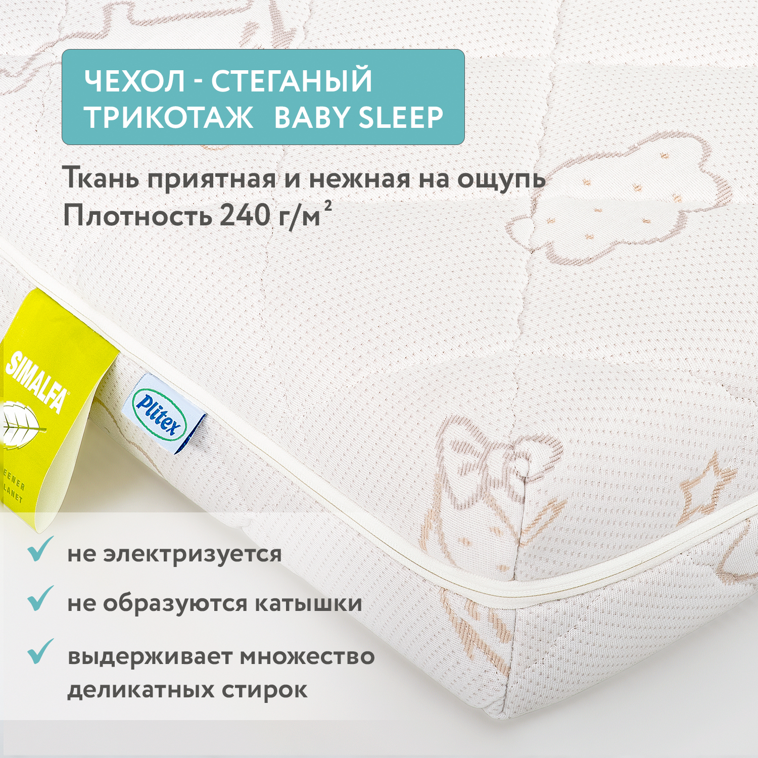 Чехол выполнен из нежного, приятного на ощупь прочного стеганого трикотажа.