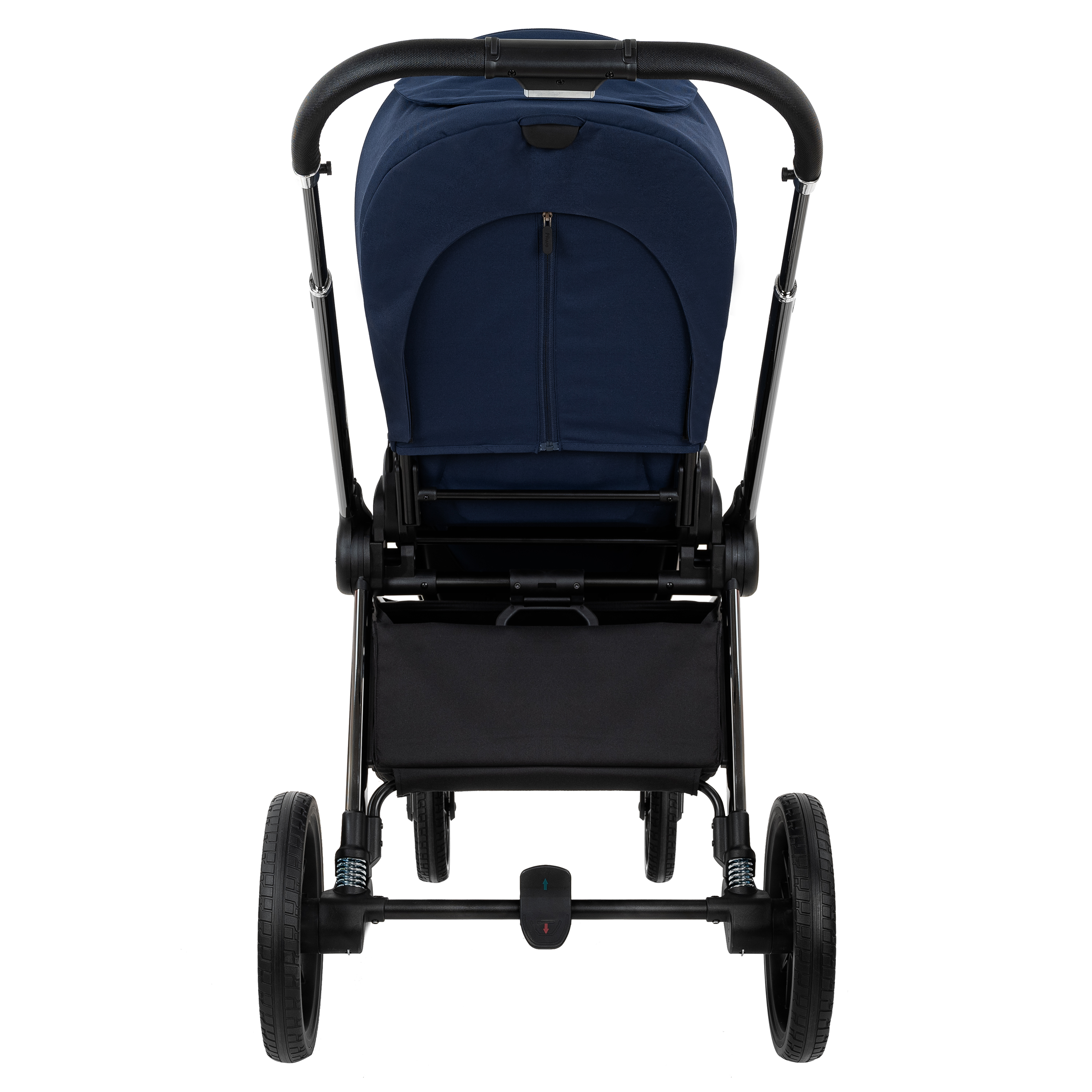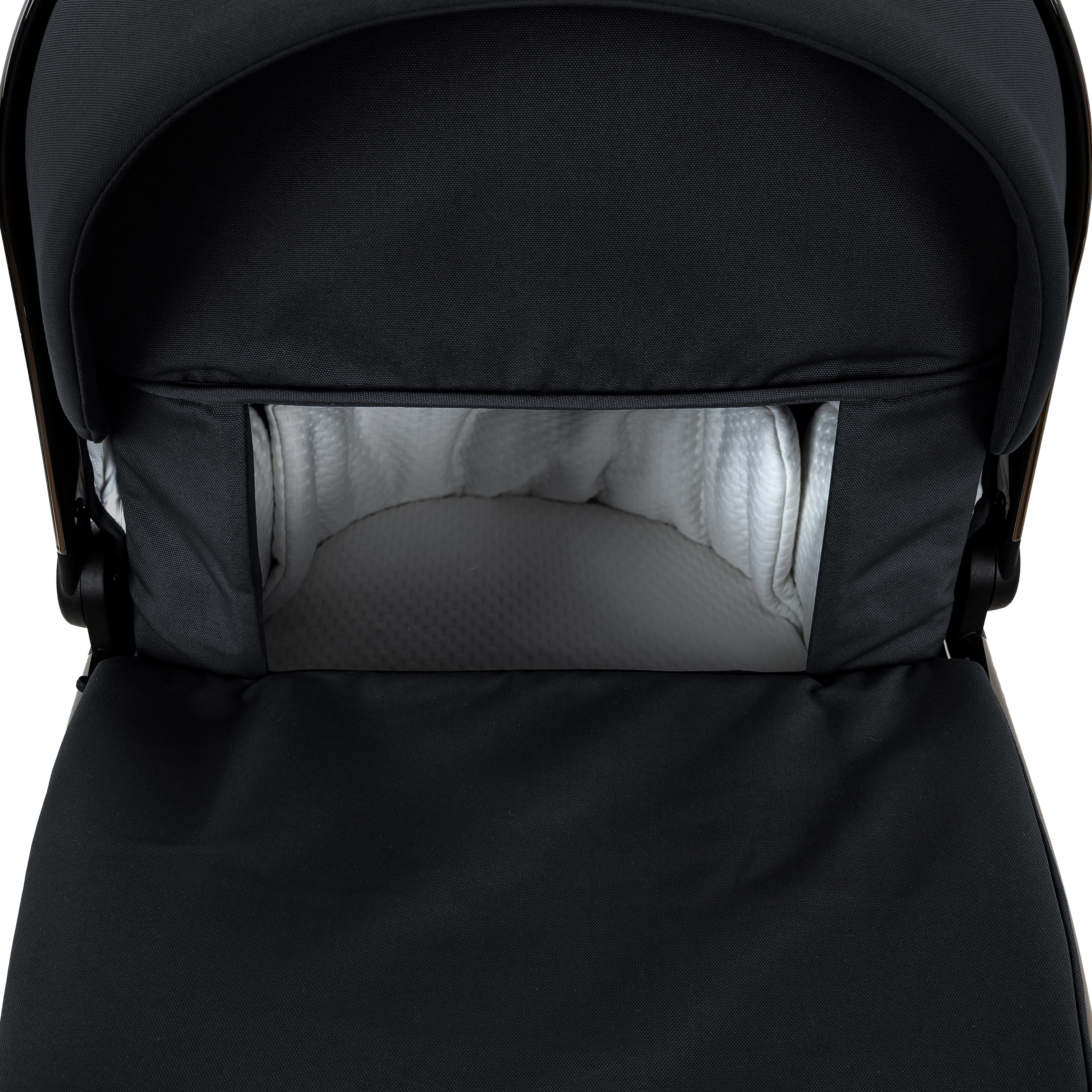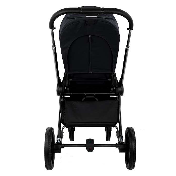 Рама из облегченного алюминия с покрытием Black Chrome имеет повышенную износостойкость и компактно складывается по типу "книжки" вместе с прогулочным блоком.
