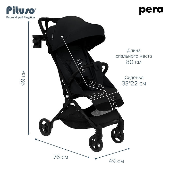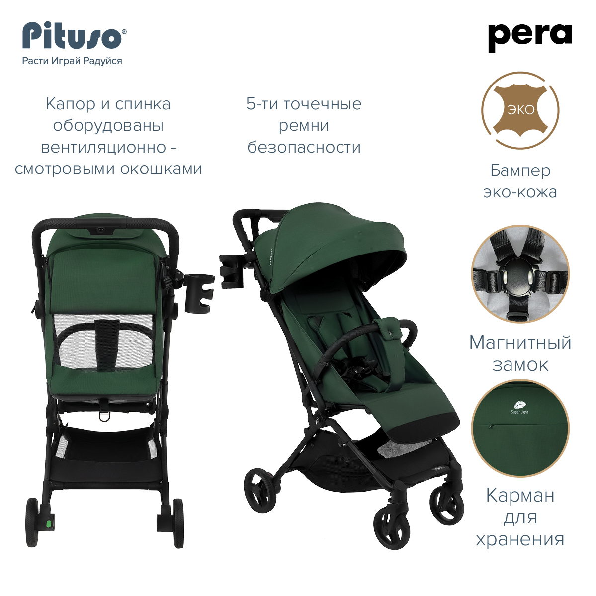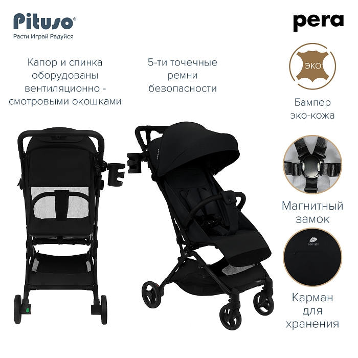 Новая версия стильной, маневренной и легкой (5.7 кг) прогулочной коляски Pituso Pera идеально подходит не только для прогулок, но и путешествий. Складываясь одной рукой до очень компактных размеров, коляска подходит под параметры ручной клади в самолете.