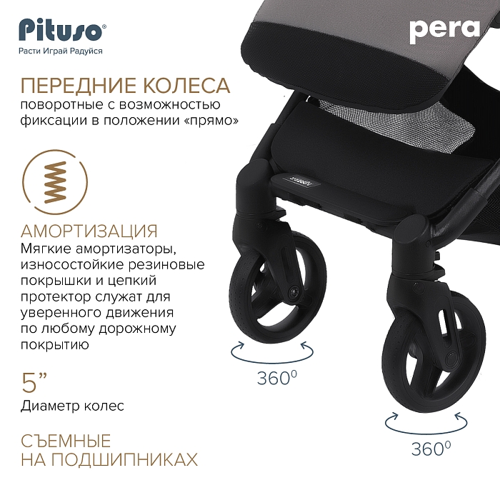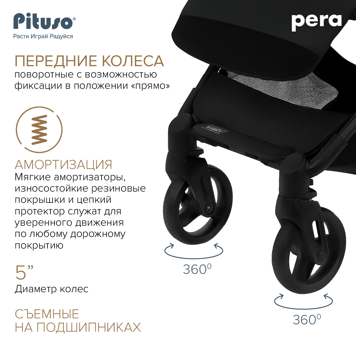 Благодаря прочной конструкции из карбона (а он гораздо прочнее и легче стали!) и надежному шасси детская коляска Pituso Pera может использоваться как универсальная коляска. Хорошая проходимость, качественная амортизация с дополнительной системой ANTISHOCK на передних колесах и повышенная маневренность.