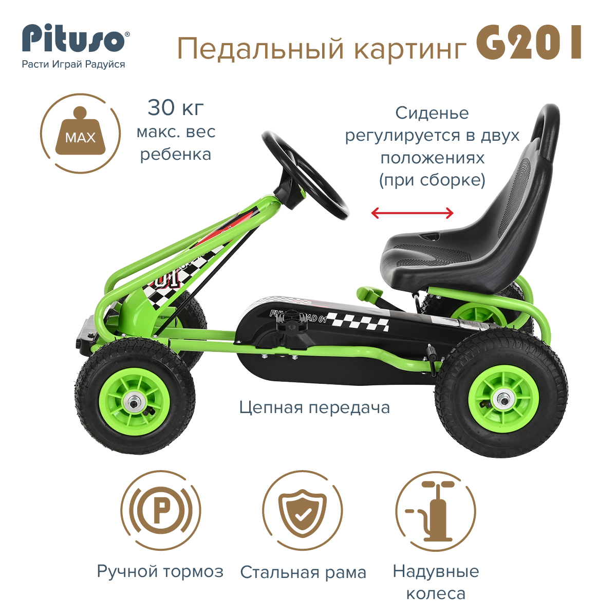 Педальный картинг Pituso G201- это прекрасное сочетание велосипеда и автомобиля. Машинка приводится в движение вращением педалей, может ездить вперед и назад. Достаточно устойчив, чтобы не опрокинуться на повороте. Современный спортивный внешний вид. Картинг вырабатывает у ребенка навыки вождения.
