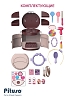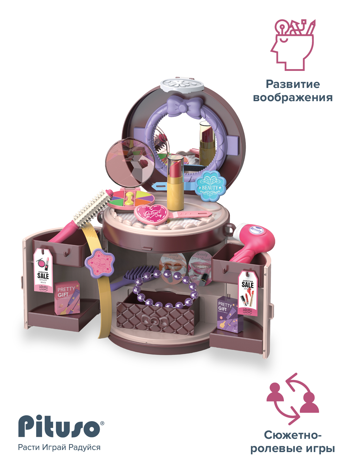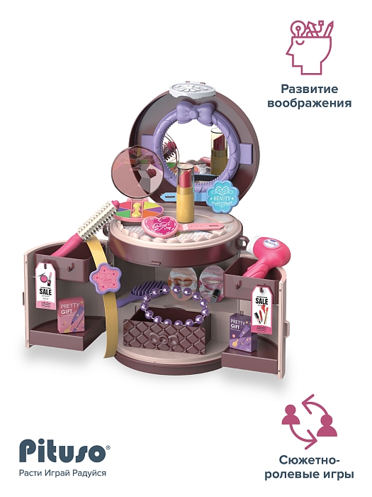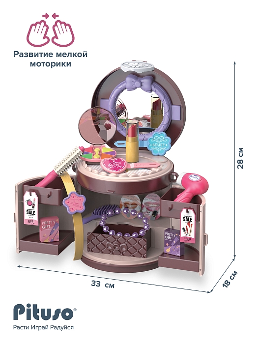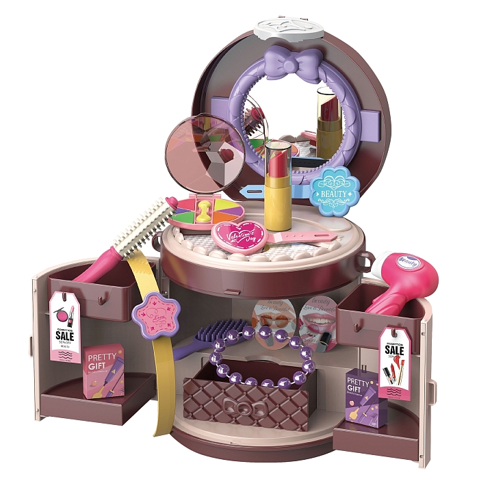 В комплекте: База (основа)-1 шт., зеркало (имитация)-1 шт, фен (имитация)-1 шт., расчестка-2шт.,ремешок-1 шт., украшения и элементы косметики - 14 шт.