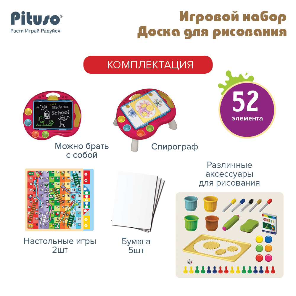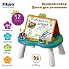 В комплект входят: Доска с основанием-1шт.,магнитные элементы-6 шт., мелки-12 шт., маркеры-5 шт., листы бумаги-5шт., настольная игра-2 шт., игральный кубик-1 шт., стаканчик-4шт, фишка-16 шт.,спирограф-1 шт.