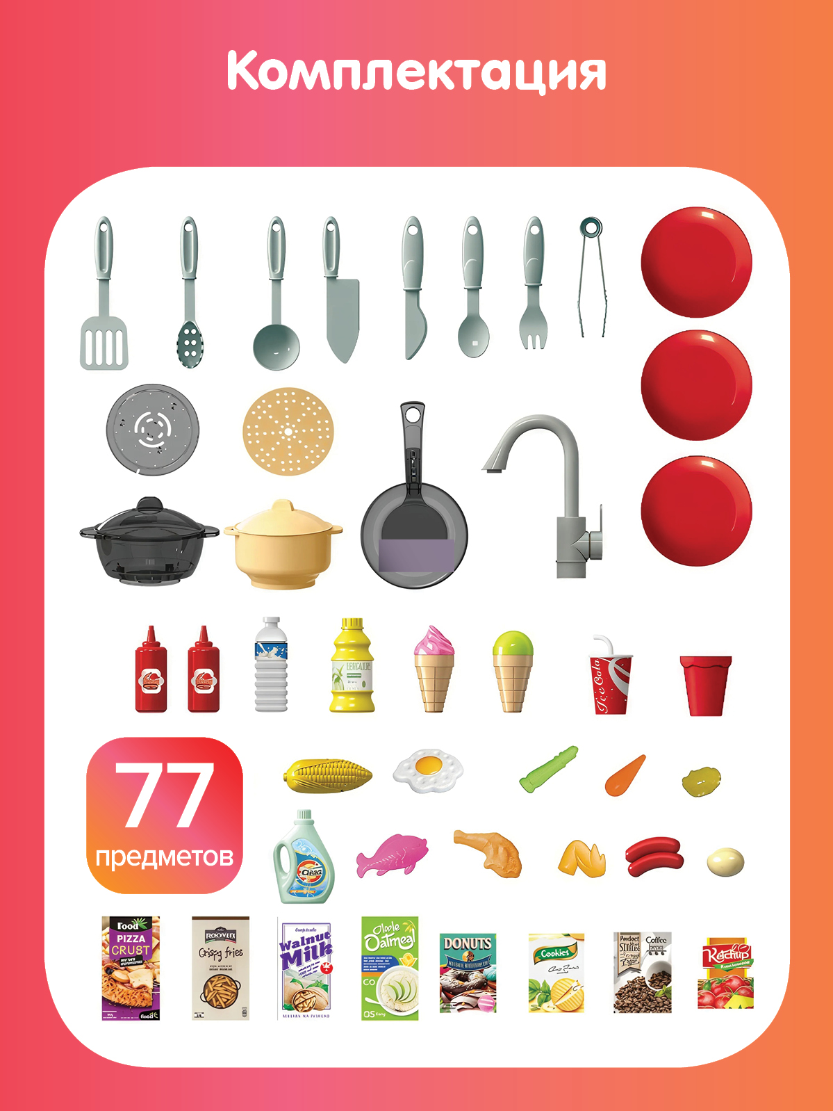 В комплект входят детали для сборки кухонной стойки, набор посуды, набор кухонных инструментов и приборов, набор фигурок-имитаций продуктов.