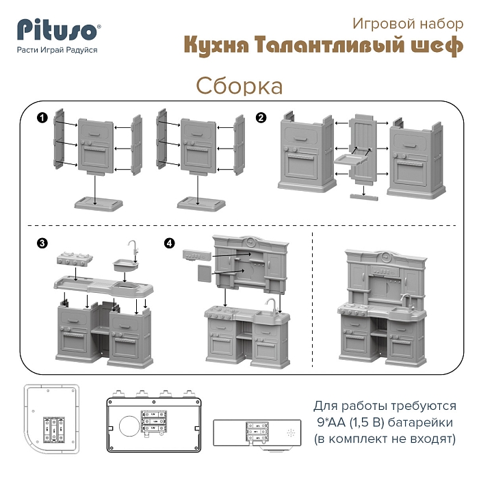 В комплект входят детали для сборки кухонной стойки, набор посуды, набор кухонных инструментов и приборов, набор фигурок-имитаций продуктов.