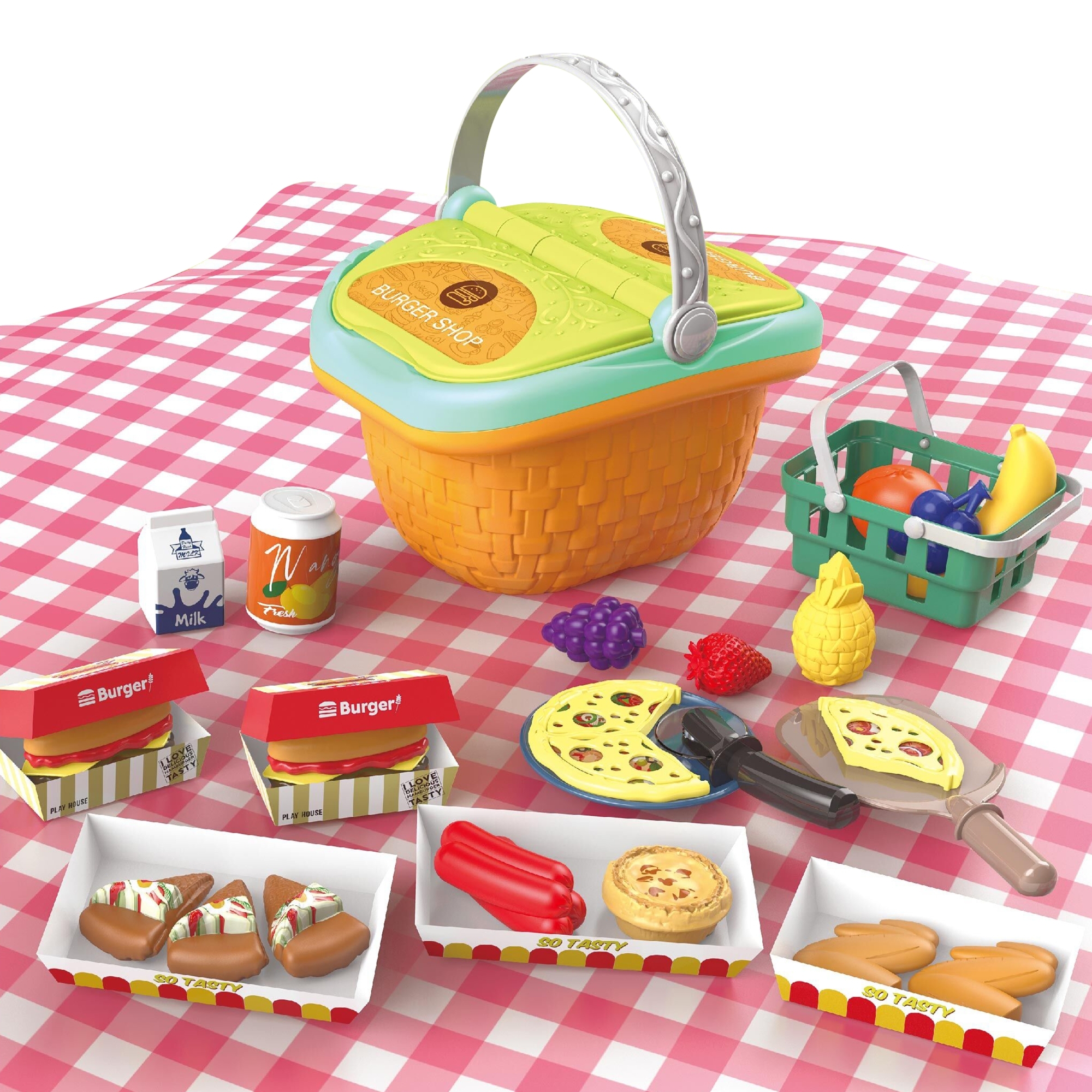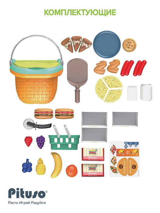 Комплектность: Корзина-1 шт.,тарелка - 1 шт, лопатка-1 шт., нож (имитация)-1 шт., продукты и напитки-28шт.