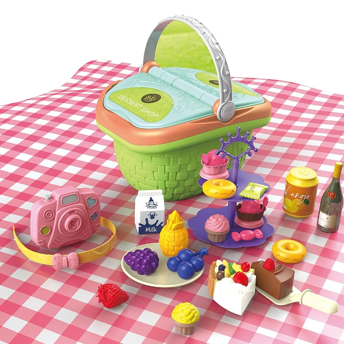 Комплектность: Корзина-1 шт., тарелка - 1 шт, лопатка-1 шт., ваза-1 шт., фотоаппарат (имитация) -1шт, продукты и напитки-22шт.