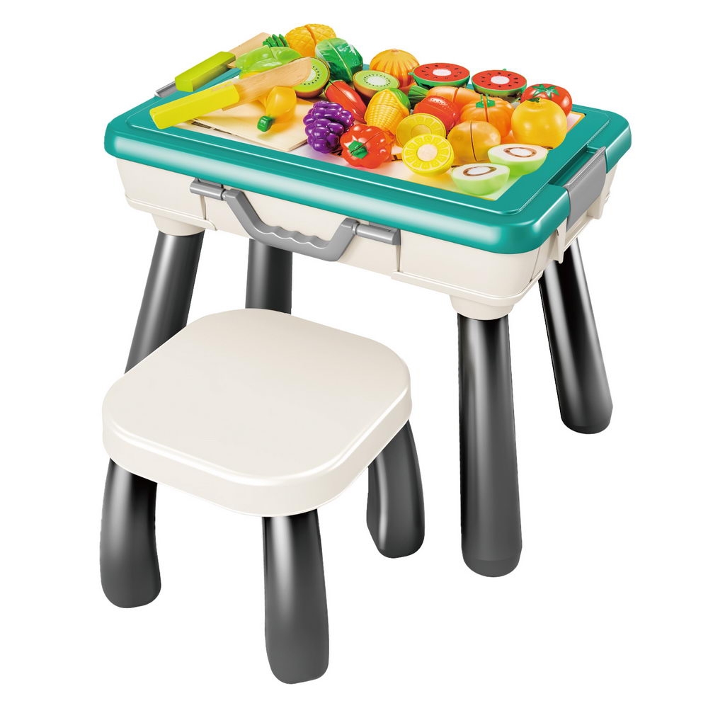Игровой набор Супершеф состоит из стола, табурета, разрезаемых овощей, фруктов, ножей и разделочной доски.