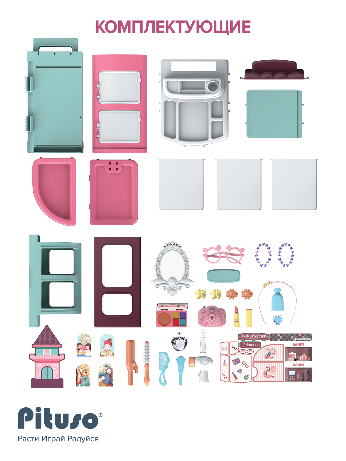 В комплекте: База (основа)-1 шт.,зеркало (имитация)-1 шт,фен (имитация)-1 шт.,расчестка-3шт.,щипцы-1шт.,очки-1шт,фотоаппарат (имитация)-1 шт.,украшения и элементы косметики - 14 шт.,тематические предметы-10 шт., комплект наклеек-1шт.