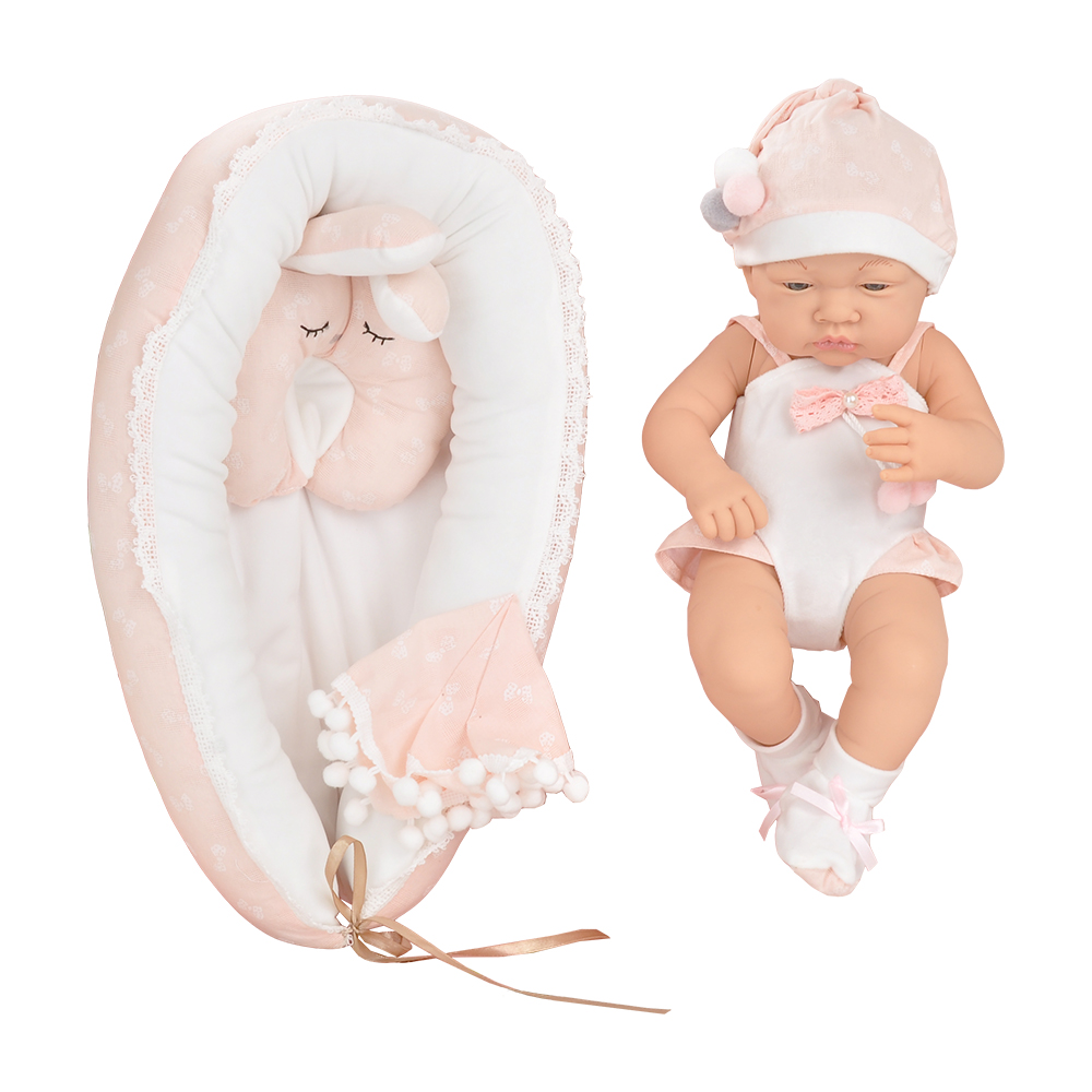 В комплекте: Пупс в боди, шапочке и носочках- 1 шт., матрасик-кокон – 1 шт., подушечка-1шт., платочек - 1 шт.