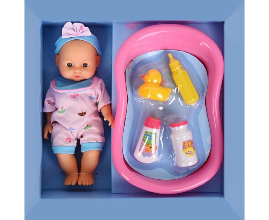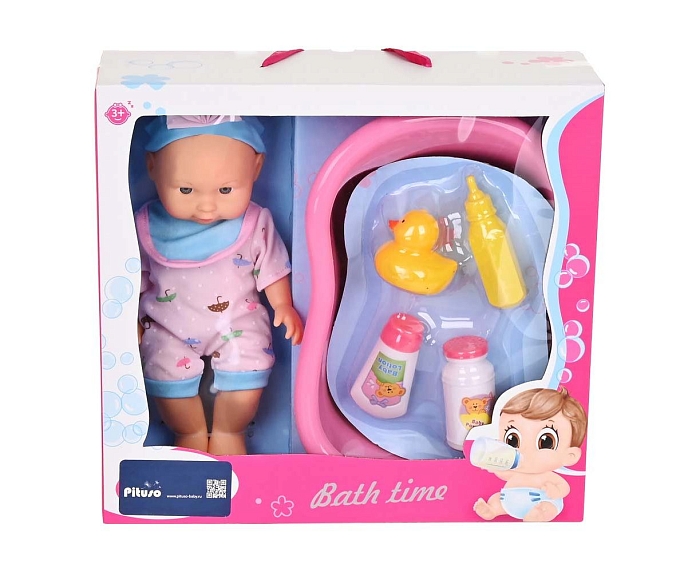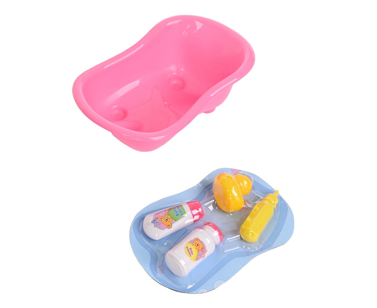 В комплекте: Пупс в боди и повязке - 1 шт., ванночка - 1 шт., бутылочка для моющих средств (имитация)- 2 шт., игрушка-уточка -1 шт., макет крема-1шт.