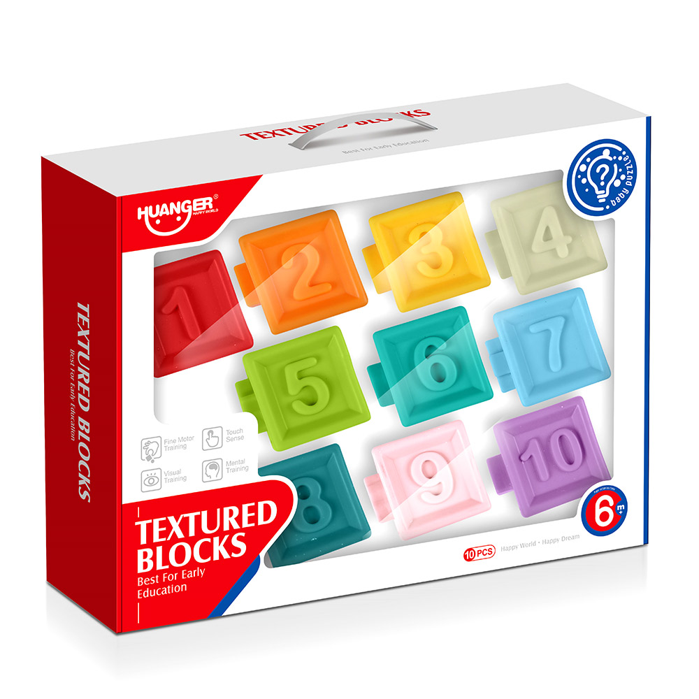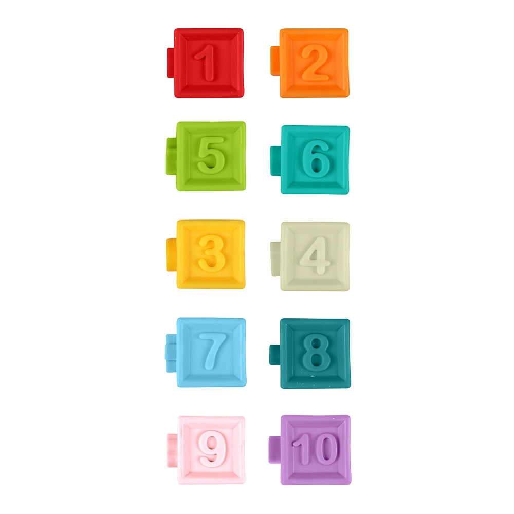 В комплект входят 10 кубиков с различными рельефными элементами.