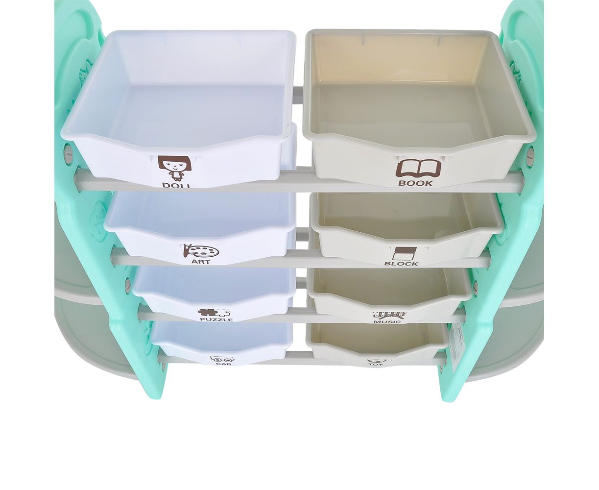 Стеллаж для игрушек с ящиками и полками выполнен из качественного пластика. Данный материал экологичен и прост в чистке. Небольшой вес стеллажа и его устойчивая конструкция обеспечивают ребёнку безопасность от ушибов.