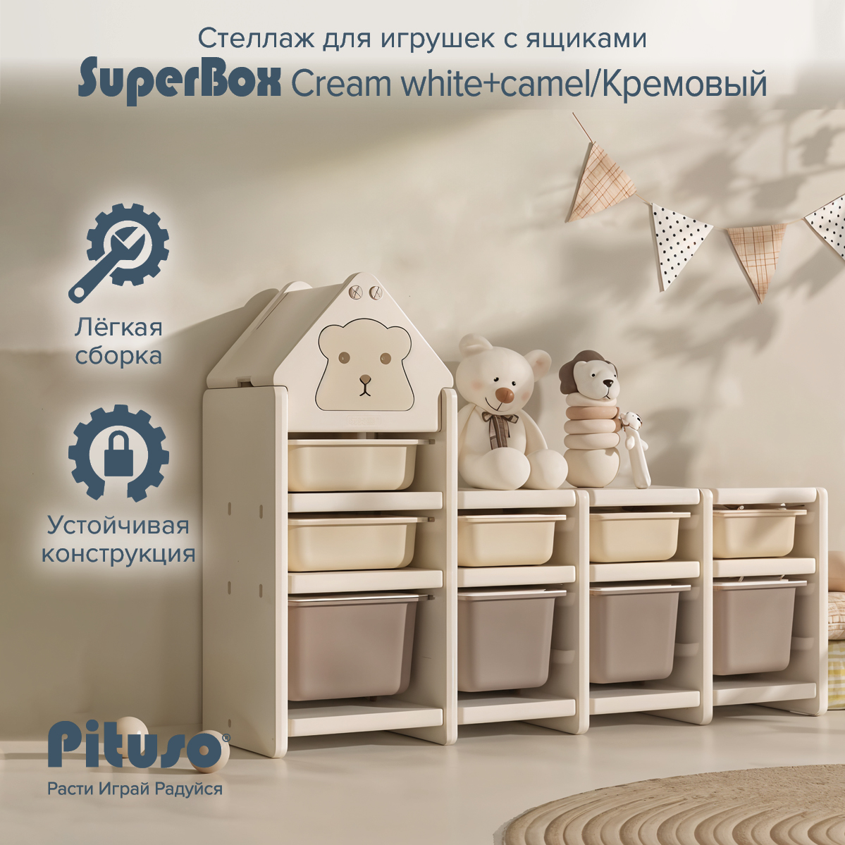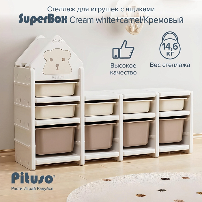 Стеллаж для игрушек Pituso с ящиками SuperBox Сream white+camel/Кремовый
