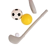 В комплект входят: мячи - 3 штуки (1-для гольфа, 1 (д.11,5см)-для баскетбола,1 (д.11,5см)-для футбола), клюшка для гольфа, кольца– 3 штуки).