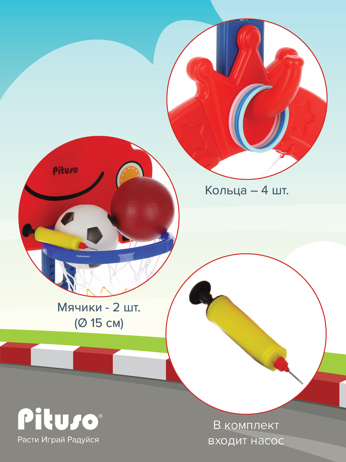 В комплект входят мячи - 2 штуки (Ø15см), кольца– 4 штуки.