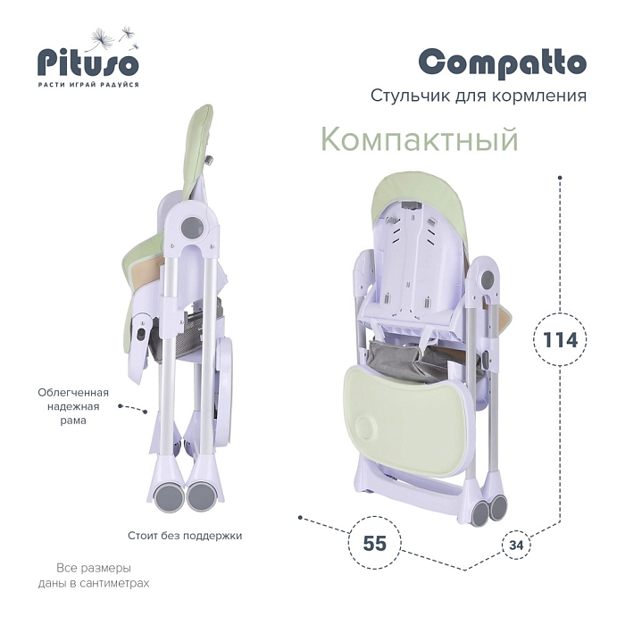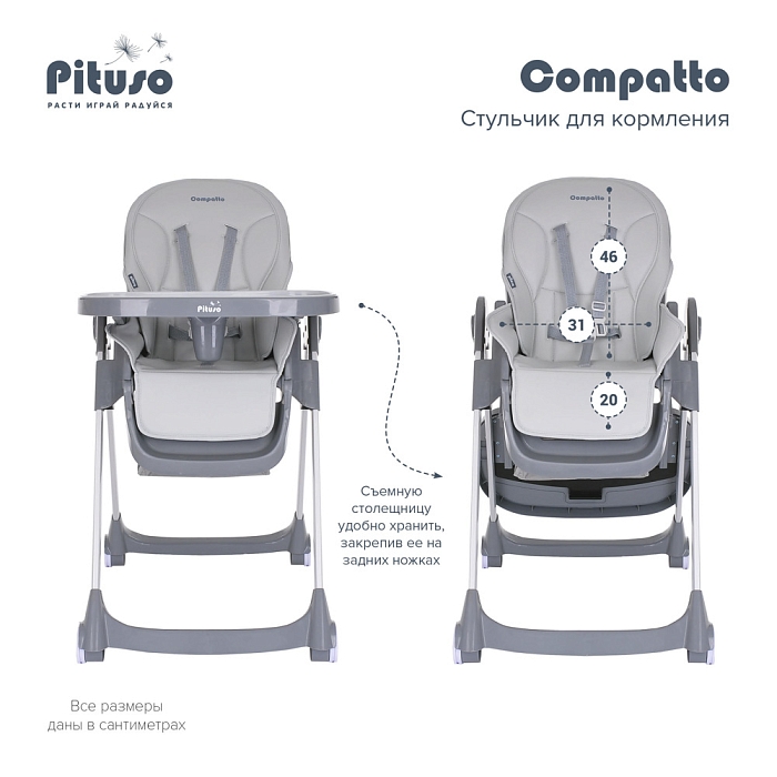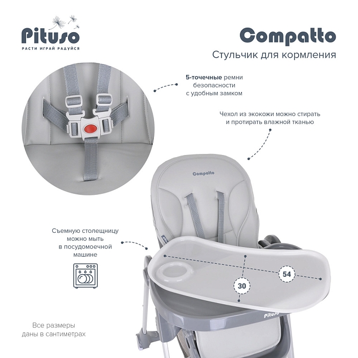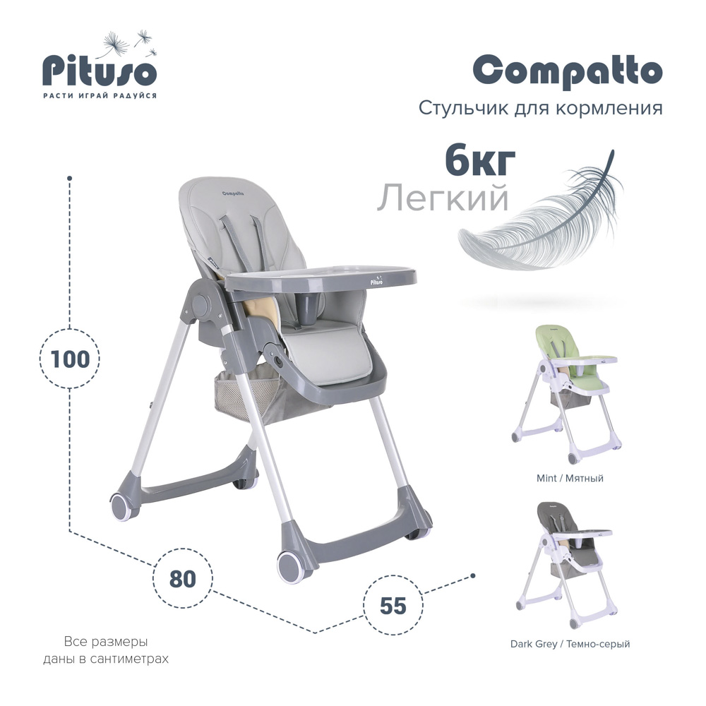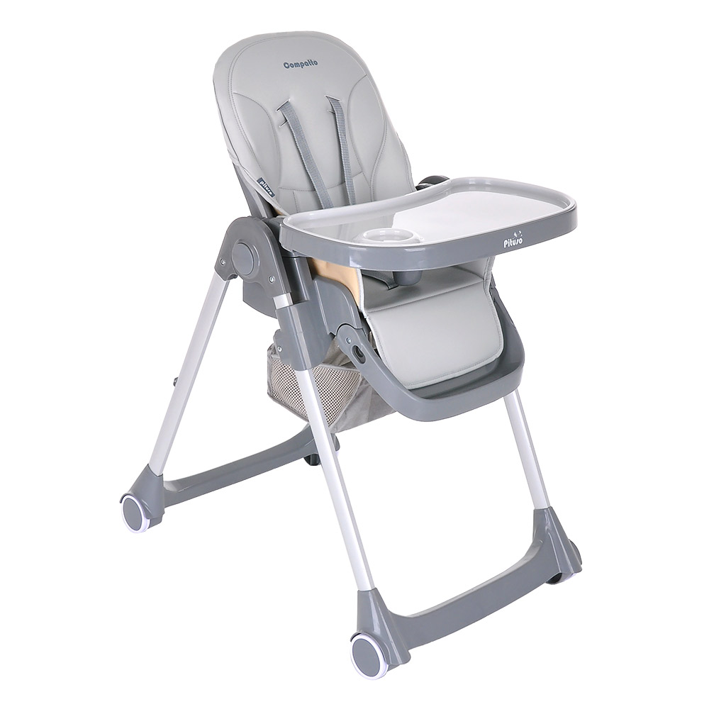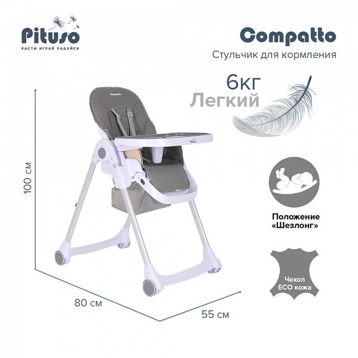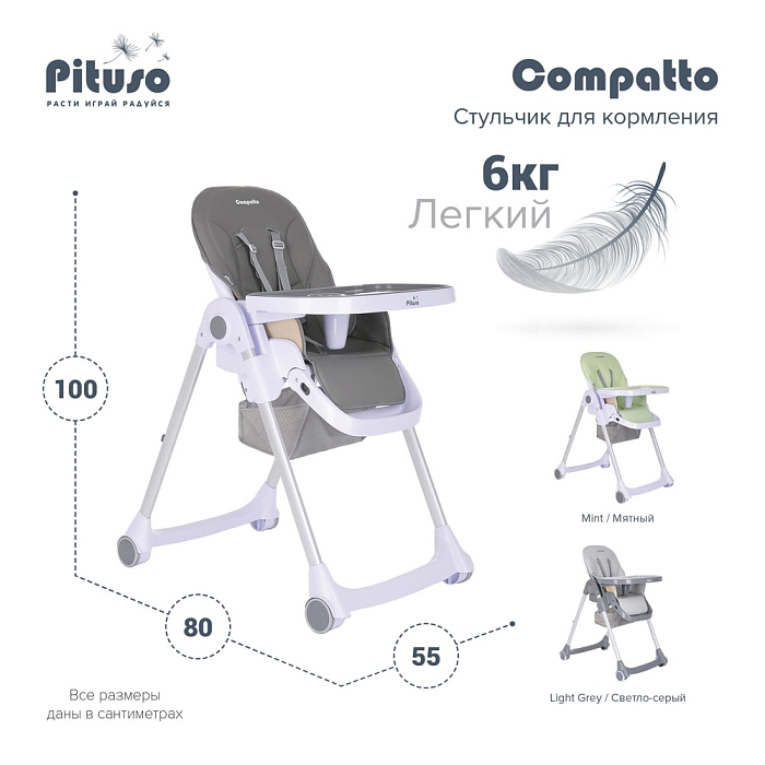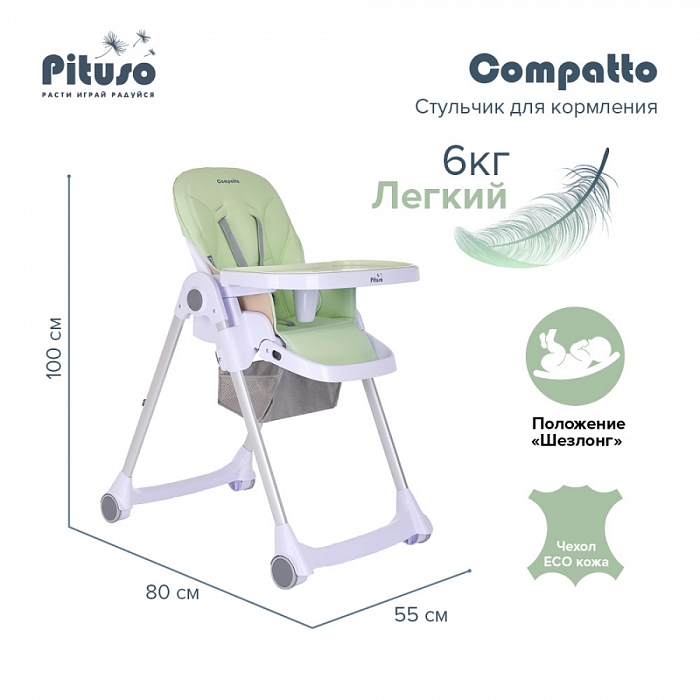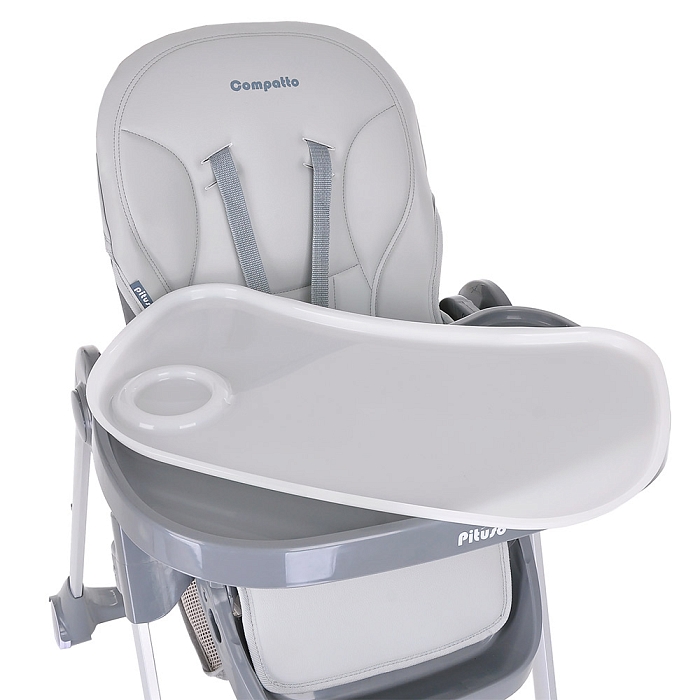 Pituso Compatto – устойчивый и комфортный стульчик для кормления. Стульчик легко складывается и не занимает много места, оснащен 2-мя колесиками, которые позволяют легко передвигать стул по дому, а благодаря съемному чехлу из ЭКО кожи стульчик удобен и прост в уходе. 3 позиции для регулировки столика позволяют настроить наилучшее положение для кормления, а лоток для приема пищи отлично моется в посудомоечной машине. Пятиточечные страховочные ремни безопасности помогут весело проводить время с малышом, не опасаясь, что ребенок может упасть. Угол наклона спинки фиксируется в 3-х положениях (сидя, полулежа и практически лежа 170 градусов максимальный угол наклона спинки). Современная эргономичная форма прекрасно впишется в любой интерьер.