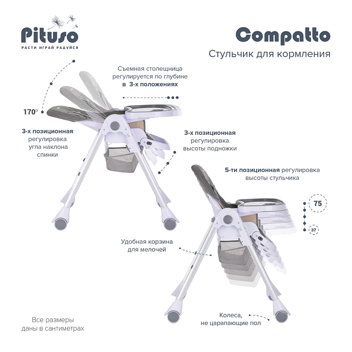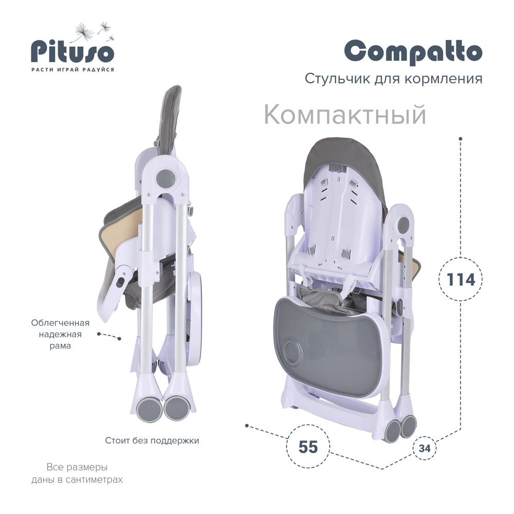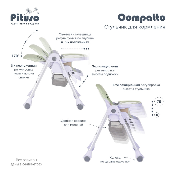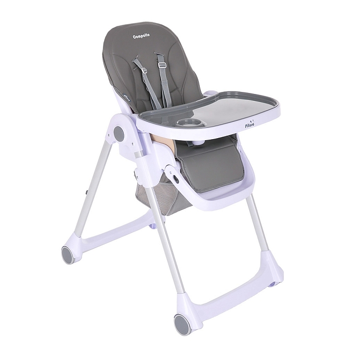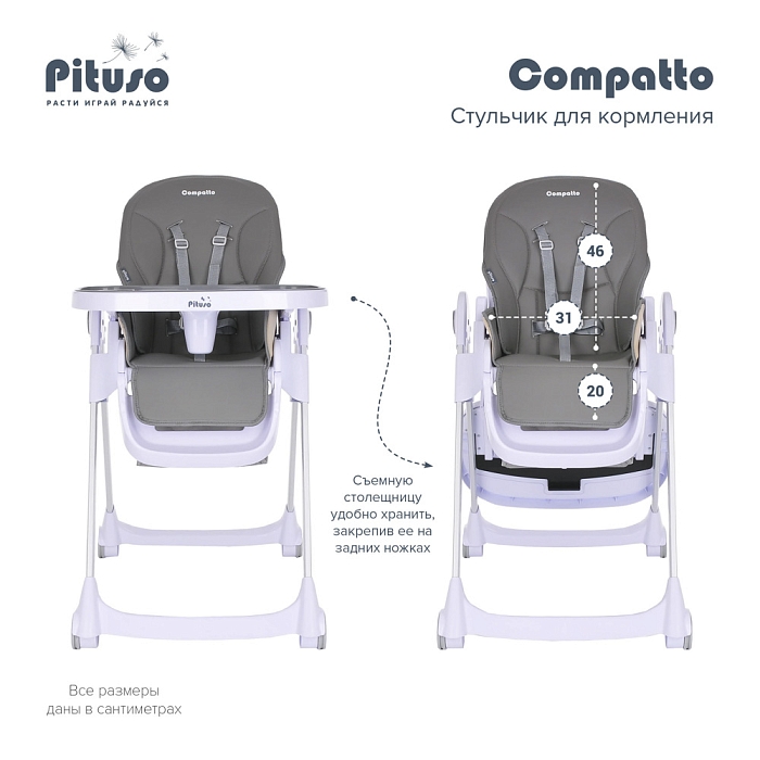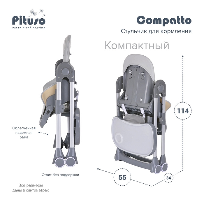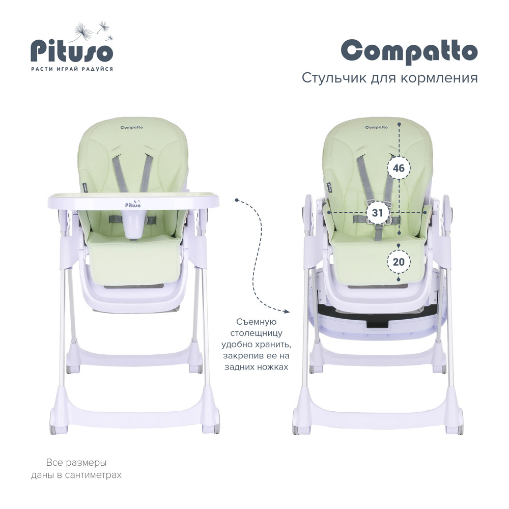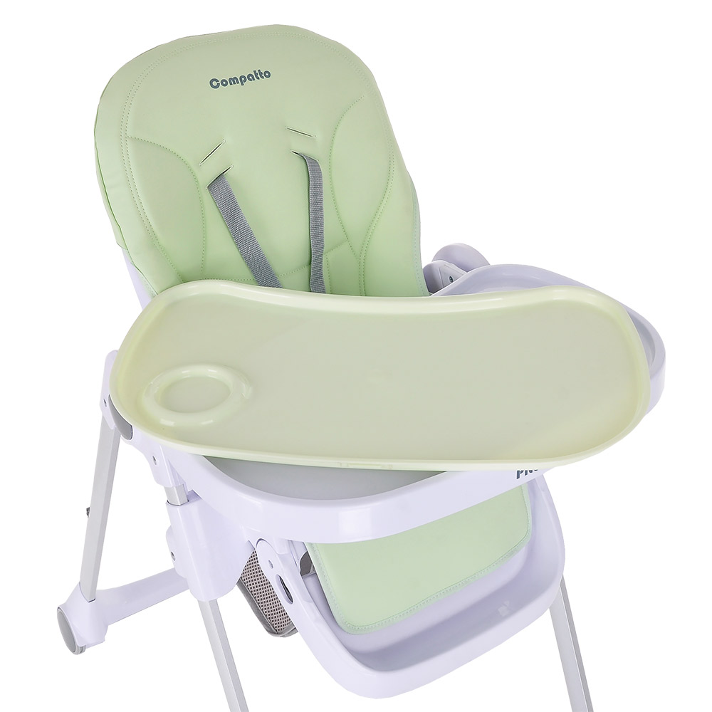 Pituso Compatto – устойчивый и комфортный стульчик для кормления. Стульчик легко складывается и не занимает много места, оснащен 2-мя колесиками, которые позволяют легко передвигать стул по дому, а благодаря съемному чехлу из ЭКО кожи стульчик удобен и прост в уходе. 3 позиции для регулировки столика позволяют настроить наилучшее положение для кормления, а лоток для приема пищи отлично моется в посудомоечной машине. Пятиточечные страховочные ремни безопасности помогут весело проводить время с малышом, не опасаясь, что ребенок может упасть. Угол наклона спинки фиксируется в 3-х положениях (сидя, полулежа и практически лежа 170 градусов максимальный угол наклона спинки). Современная эргономичная форма прекрасно впишется в любой интерьер.