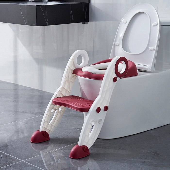 Конструкция имеет удобные поручни и регулируемую по высоте ступеньку, поэтому ребенок может самостоятельно садиться на унитаз и слезать с него. Кроме того, ступенька служит подставкой для ног, когда малыш сидит на унитазе.